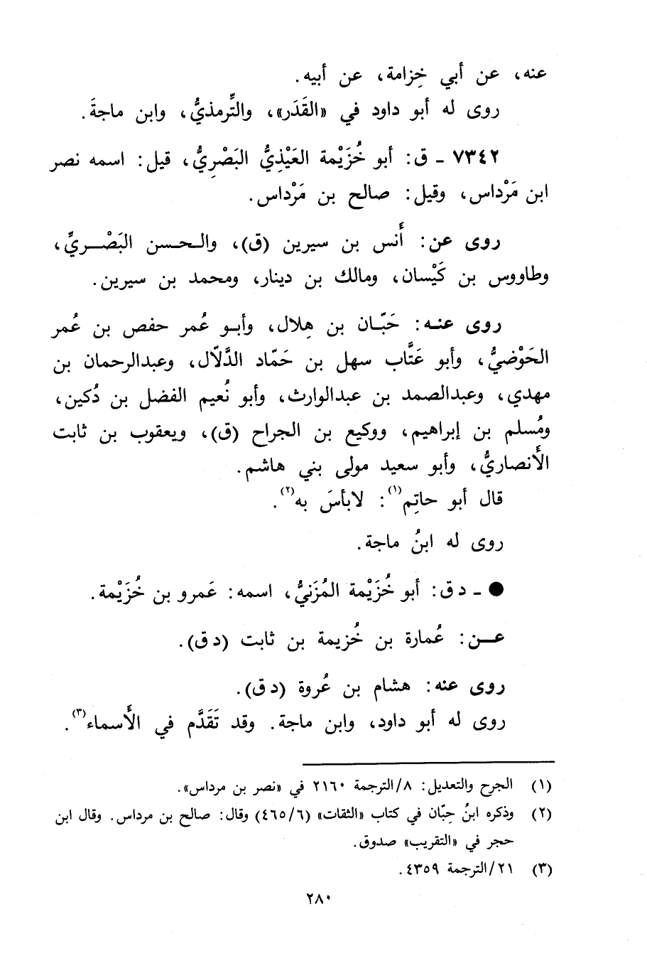 7342 - ق: أَبُو خزيمة العيذي البَصْرِيّ، قيل: اسمه نصر ابن مرداس، وقيل: صالح بْن مرداس.