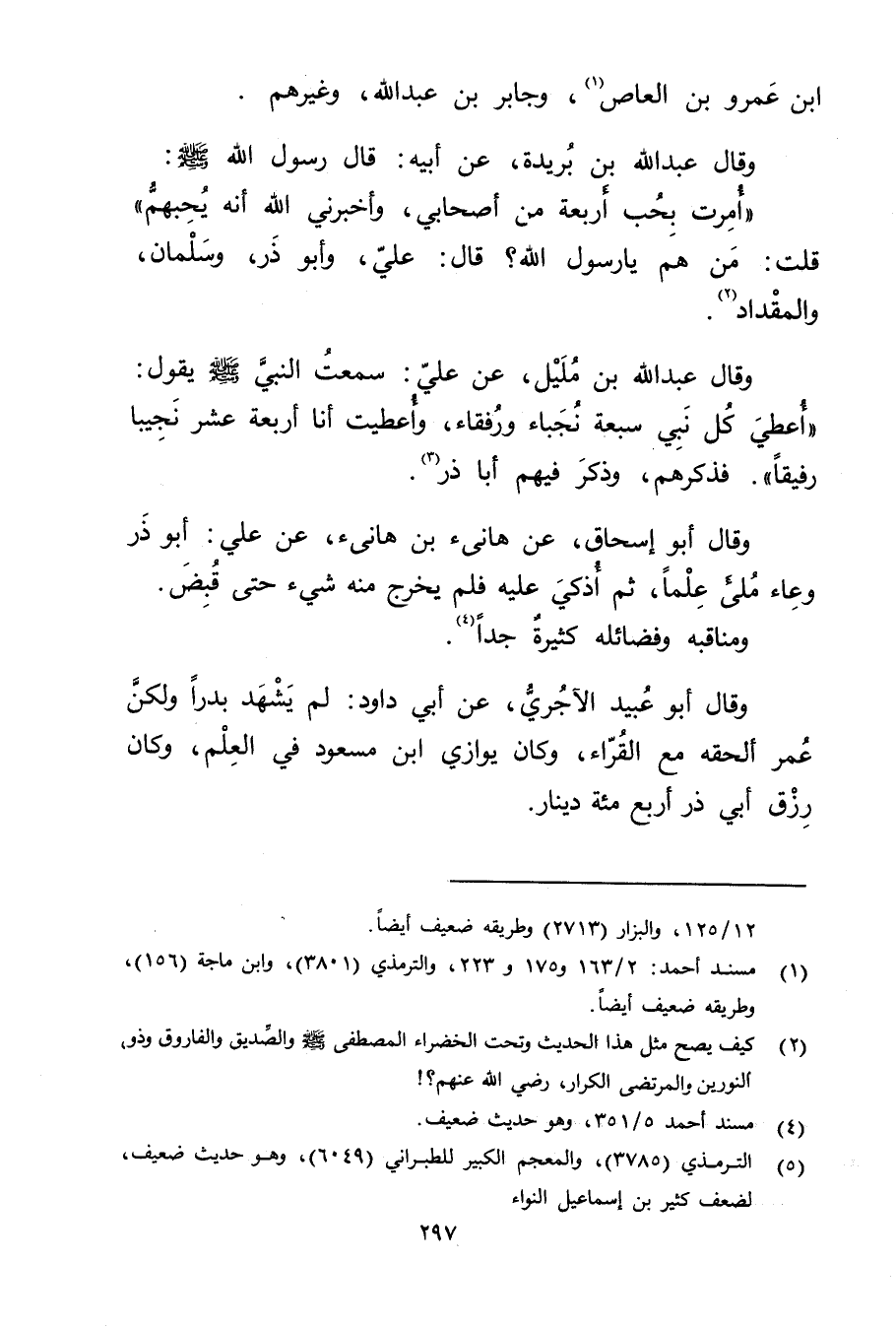 وَقَال عَبد اللَّهِ بْنِ بُرَيْدَةَ، عَن أَبِيهِ: قال رَسُولُ اللَّهِ صلى الله عليه وسلم: أُمِرْتُ بُحِبِّ أَرْبَعَةٌ مِنْ أَصْحَابِي، وأَخْبَرَنِي اللَّهُ أَنَّهُ يُحِبُّهُمْ" قُلْتُ: مَنْ هُمْ يَا رَسُولَ اللَّهِ؟ قال: عَلِيٌّ، وأَبُو ذَرٍّ، وسَلْمَانُ، والْمِقْدَادُ (2) .