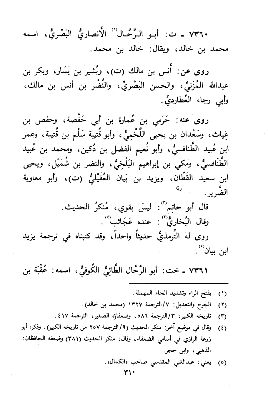 7360 - ت: أَبُو الرحال (1) الأَنْصارِيّ البَصْرِيّ، اسمه مُحَمَّد بْن خالد، ويُقال: خالد بْن مُحَمَّد.