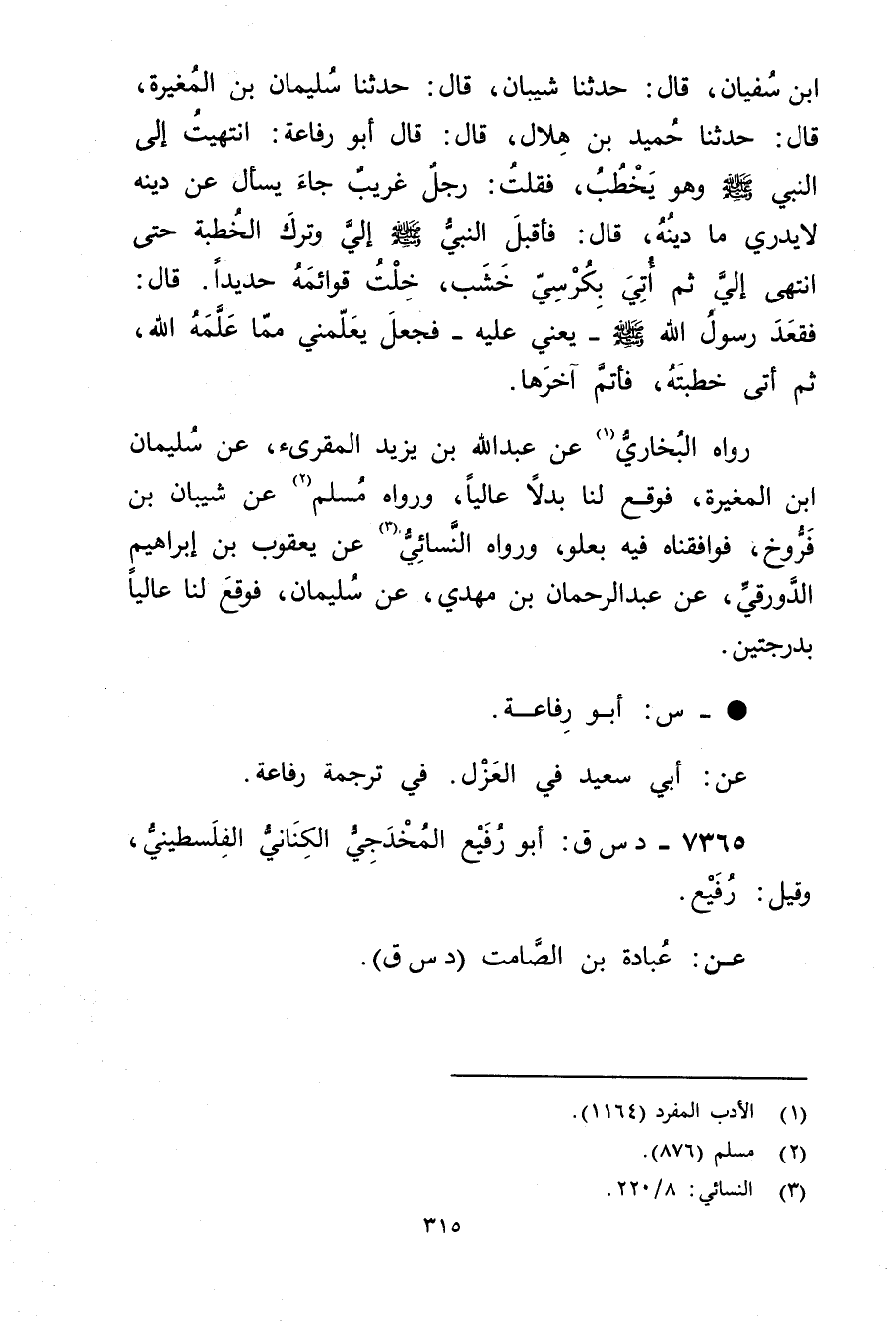 ابن سُفْيَانَ، قال: حَدَّثَنَا شَيْبَانُ، قال: حَدَّثَنَا سُلَيْمان بْنُ الْمُغِيرَةَ، قال: حَدَّثَنَا حُمَيْدُ بْنُ هِلالٍ، قال: قال أَبُو رِفَاعَةَ: انْتَهَيْتُ إِلَى النَّبِيُّ صلى الله عليه وسلم وهُوَ يَخْطُبُ، فَقُلْتُ: رَجُلٌ غَرِيبٌ جَاءَ يَسْأَلُ عَنْ دِينِهِ لا يَدْرِي مَا دِينُهُ، قال: فَأَقْبَلَ النَّبِيُّ صلى الله عليه وسلم إِلَيَّ وتَرَكَ الْخُطْبَةَ حَتَّى انْتَهَى إِلَيَّ ثُمَّ أُتِيَ بِكُرْسِيٍّ خَشَبٍ، خِلْتُ قَوَائِمَهُ حَدِيدًا". قال: فَقَعَدَ رَسُول اللَّهِ صلى الله عليه وسَلَّمَ، يَعْنِي عَلَيْهِ - فَجَعَلَ يَعُلِّمُنِي مِمَّا عَلَّمَهُ اللَّهُ، ثُمَّ أَتَى خُطْبَتَهُ، فَأَتَّمَ آخِرَهَا.