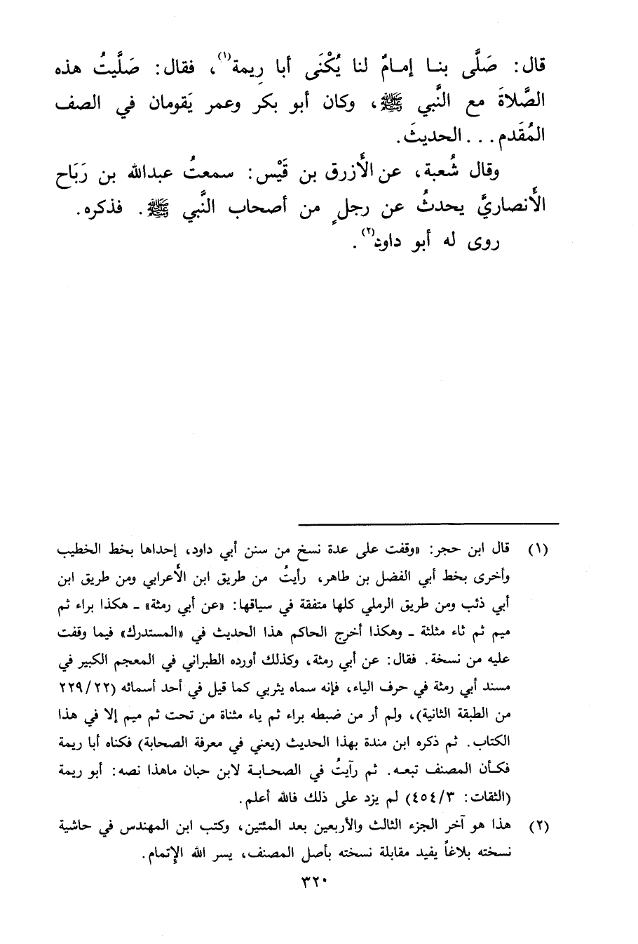 (1) قال ابن حجر: وقفت على عدة نسخ من سنن أبي داود، إحداها بخط الخطيب وأخرى بخط أبي الفضل بن طاهر، رأيت من طريق ابن الاعرابي ومن طريق ابن أَبي ذئب ومن طريق الرملي كلها متفقة في سياقها: عَن أبي رمثة" - هكذا براء ثم ميم ثم ثاء مثلثة - وهكذا أخرج الحاكم هذا الحديث في " المستدرك" فيما وقفت عليه من نسخة. فقال: عَن أبي رمثة، وكذلك أورده الطبراني في المعجم الكبير في مسند أبي رمثة في حرف الياء، فإنه سماه يثربي كما قيل في أحد أسمائه (22 / 229 من الطبقة الثانية) ، ولم أر من ضبطه براء ثم ياء مثناة من تحت ثم ميم إلا في هذا الكتاب.