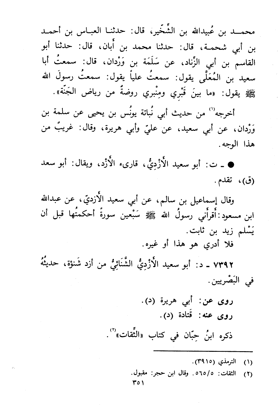 مُحَمَّد بْن عُبَيد اللَّهِ بْن الشِّخِّيرِ، قال: حَدَّثَنَا الْعَبَّاسُ بْنُ أَحْمَدَ بْنِ أَبي شَحْمَةَ، قال: حَدَّثَنَا مُحَمَّد بْن أبان، قال: حَدَّثَنَا أَبُو الْقَاسِمِ بْنُ أَبي الزِّنَادِ، عَنْ سَلَمَةَ بْنِ ورْدَانَ، قال: سَمِعْتُ أَبَا سَعِيد بْنِ الْمُعَلَّى يَقُولُ: سَمِعْتُ عَلِيًّا" يَقُولُ: سمعت رَسُول اللَّهِ صَلَّى اللَّهُ عَلَيْهِ وسَلَّمَ يَقُولُ: مَا بَيْنَ قَبْرِي ومِنْبَرِي رَوْضَةٌ مِنْ رِيَاضِ الْجَنَّةِ.