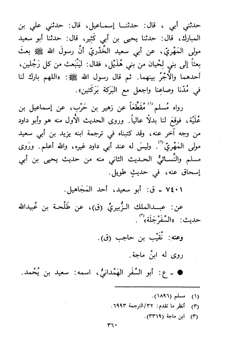 حَدَّثني أَبِي، قال: حَدَّثَنَا إِسْمَاعِيلُ، قال: حدثني عَلِيِّ بْنِ الْمُبَارَكِ، قال: حَدَّثَنَا يحيى بْن أَبي كثير، قال: حَدَّثَنَا أَبُو سَعِيد مَوْلَى الْمَهْرِيِّ، عَن أبي سَعِيد الخُدْرِيّ أَنَّ رَسُول اللَّهِ صلى الله عليه وسَلَّمَ بَعَثَ بَعْثًا" إِلَى بَنِي لحيان مِنْ بَنِي هُذَيْلٍ، فَقَالَ: لِيَنْبَعِثَ مِنْ كُلِّ رَجُلَيْنِ، أَحَدُهُمَا والأَجْرُ بَيْنَهُمَا.