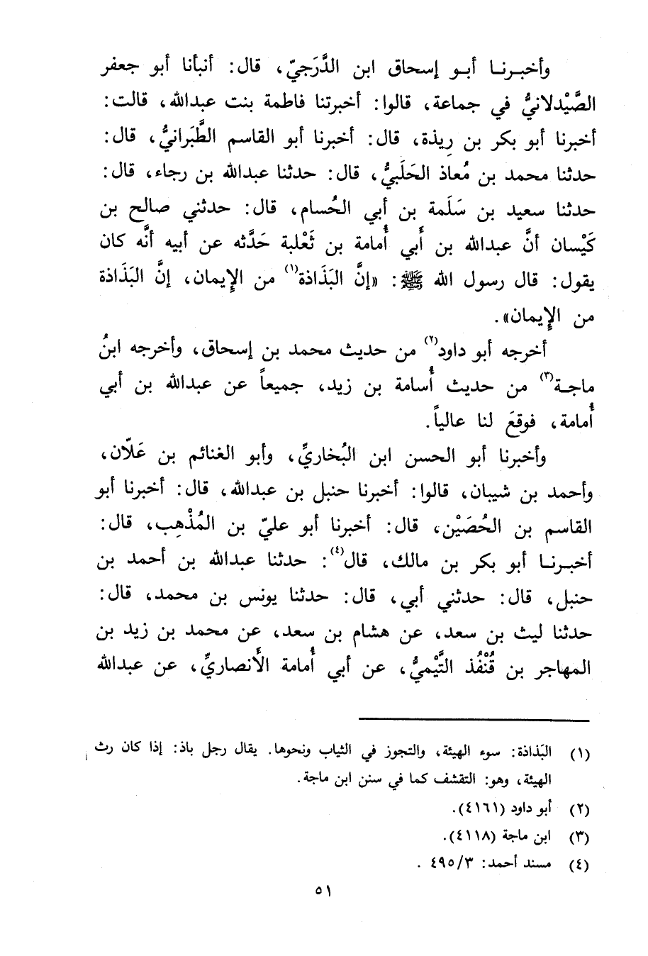 وأَخْبَرَنَا أَبُو إِسْحَاقَ ابْنُ الدَّرَجِيِّ، قال: أنبأنا أَبُو جَعْفَرٍ الصَّيْدَلانِيُّ فِي جَمَاعَةٍ، قَالُوا: أَخْبَرَتْنا فَاطِمَةُ بِنْتُ عَبد اللَّهِ، قَالَتْ: أخبرنا أَبُو بَكْرِ بْنُ رِيذَةَ، قال: أخبرنا أَبُو الْقَاسِمِ الطَّبَرَانِيُّ، قال: حَدَّثَنَا مُحَمَّدُ بْنُ مُعَاذٍ الْحَلَبِيُّ، قال: حَدَّثَنَا عَبد اللَّهِ بْن رَجَاءٍ، قال: حَدَّثَنَا سَعِيد بْنُ سَلَمَةَ بْنِ أَبي الْحُسَامِ، قال: حَدَّثَنِي صَالِحُ بْنُ كَيْسَانَ أَنَّ عَبد اللَّهِ بْن أَبي أمامة بْنِ ثَعْلَبَةَ حَدَّثَهُ عَن أَبِيهِ أَنَّهُ كَانَ يَقُولُ: قال رَسُولُ اللَّهِ صلى الله عليه وسلم: إِنَّ الْبَذَاذَةَ (1) مِنَ الإِيمَانِ، إِنَّ الْبَذَاذَةَ مِنَ الإِيمَانِ.