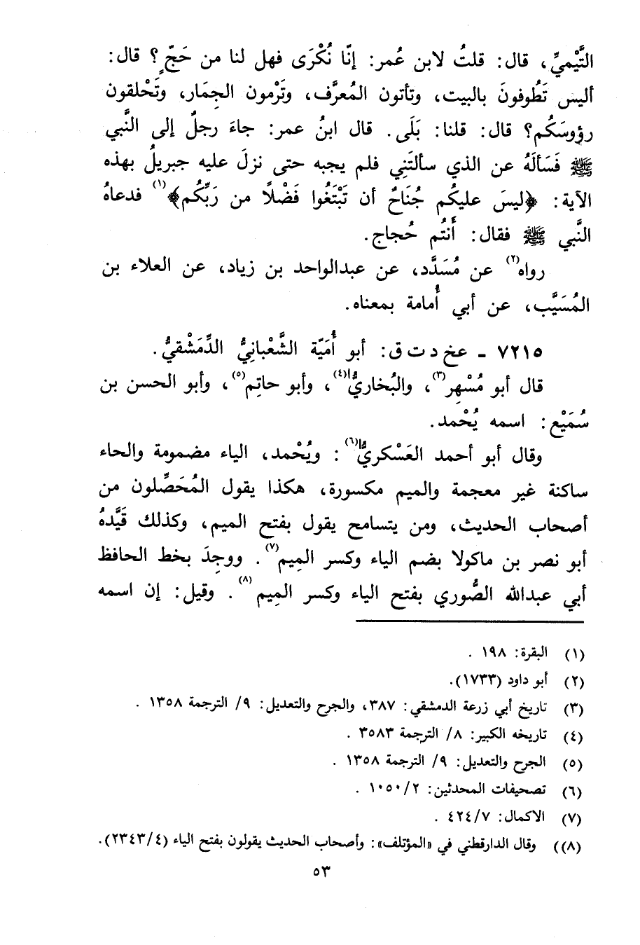 التَّيْمِيّ، قال: قُلْتُ لابْنِ عُمَر: إِنَّا نُكْرَى فَهَلْ لَنَا مِنْ حَجٍّ؟ قال: أَلَيْسَ تَطُوفُونَ بِالْبَيْتِ، وتَأْتُونَ الْمُعَرَّفَ، وتَرْمُونَ الْجِمَارَ، وتَحْلِقُونَ رؤوسكم؟ قال: قُلْنَا: بَلَى. قال ابْنُ عُمَر: جَاءَ رَجُلٌ إِلَى النَّبِيِّ صَلَّى اللَّهُ عَلَيْه وسَلَّمَ فَسَأَلَهُ عَنِ الَّذِي سَأَلْتَنِي فَلَمْ يُجِبْهُ حَتَّى نَزَلَ عَلَيْهِ جِبْرِيلُ بِهَذِهِ الآيَةِ: {لَيْسَ عَلَيْكُمْ جُنَاحٌ أَنْ تَبْتَغُوا فَضْلا مِنْ رَبِّكُمْ) {1) فَدَعَاهُ النَّبِيُّ صلى الله عليه وسلم فَقَالَ: أَنْتُمْ حُجَّاجٌ.