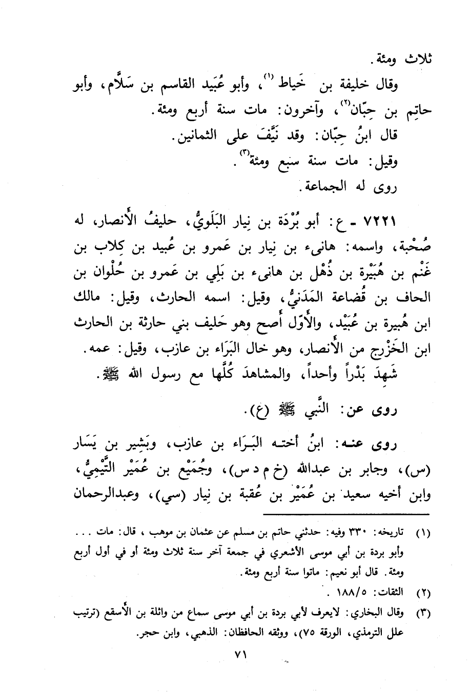 7221 - ع: أَبُو بردة بن نيار البلوي، حليف الأَنْصَار، لهُ صُحبَةٌ، واسمه: هانئ بْن نيار بْن عَمْرو بْن عُبَيد بْن كلاب بْن غنم بْن هبيرة بْن ذهل بْن هانئ بْن بلي بْن عَمْرو بْن حلوان بْن الحاف بْن قضاعة المدني، وقيل: اسمه الحارث، وقيل: مالك ابن هبيرة بْن عُبَيد، والأول أصح وهو حليف بني حارثة بْن الحارث ابن الخزرج من الأَنْصَار، وهو خال البراء بْن عازب، وقيل: عمه. شهد بدرا واحدا، والمشاهد كلها مَعَ رَسُولِ اللَّهِ صَلَّى اللَّهُ عَلَيْهِ وسَلَّمَ.