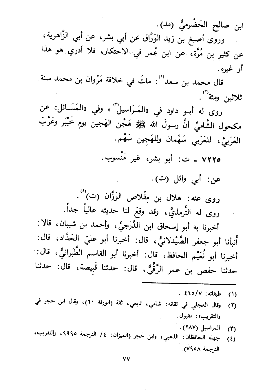 روى له أَبُو داود فِي " المراسيل (3) " وفي" المسائل" عَنْ مكحول الشامي أن رَسُول اللَّه صَلَّى اللَّهُ عليه وسلم هجن الهجين يوم خيبر وعرب العربي، للعربي سهمان وللهجين سهم.