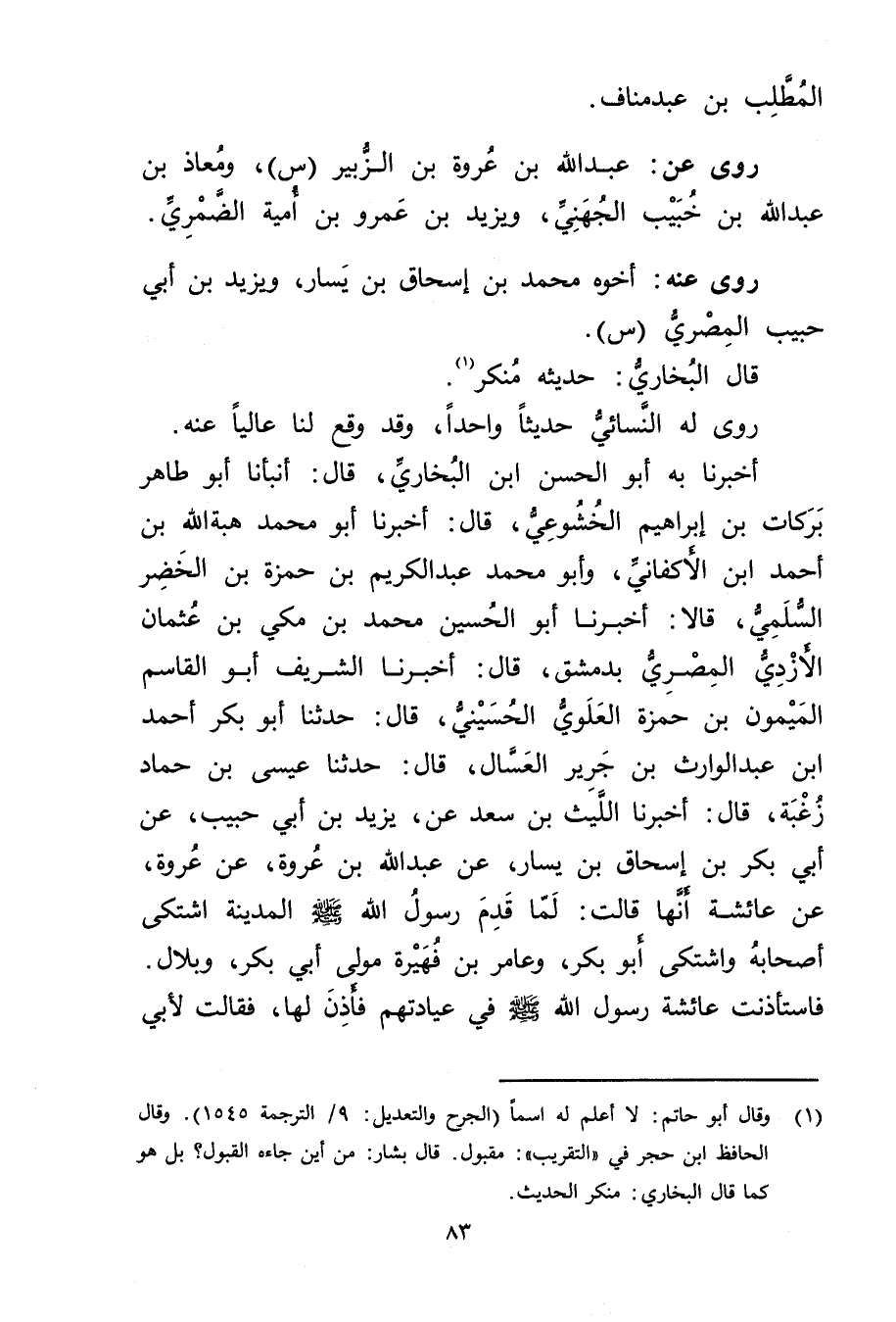 أَخْبَرَنَا بِهِ أَبُو الْحَسَنِ بْنُ الْبُخَارِيِّ، قال: أَنْبَأَنَا أَبُو طَاهِرٍ بَرَكَاتُ بْنُ إِبْرَاهِيمَ الْخُشُوعِيُّ، قال: أَخْبَرَنَا أَبُو مُحَمَّدٍ هِبَةُ اللَّهِ بْنُ أَحْمَدَ بْنِ الأَكْفَانِيِّ، وأَبُو مُحَمَّدٍ عبد الكريم بْن حمزة بْن الْخِضْرِ السُّلَمِيُّ، قَالا: أَخْبَرَنَا أَبُو الْحُسَيْنِ مُحَمَّدُ بْنُ مَكِّيِّ بْنِ عُثْمَانَ الأَزْدِيُّ المِصْرِي بِدِمَشْقَ، قال: أَخْبَرَنَا الشَّرِيفُ أَبُو الْقَاسِمِ الْمَيْمُونُ بْنُ حَمْزَةَ الْعَلَوِيُّ الْحُسَيْنِيُّ، قال: حَدَّثَنَا أَبُو بَكْر أَحْمَد بْن عبد الوارث بْن جرير العسال، قال: حَدَّثَنَا عِيسَى بْنُ حَمَّادٍ زَغْبَةُ، قال: أَخْبَرَنَا اللَّيْثُ بْنُ سَعْدٍ عَنْ، يَزِيدَ بْنِ أَبي حَبِيبٍ، عَنْ أَبِي بَكْرِ بْنِ إسحاق بن يسار، عَنْ عَبد اللَّهِ بن عروة، عن عروة، عَنْ عَائِشَةَ أَنَّهَا قَالَتْ: لَمَّا قَدِمَ رَسُولُ اللَّهِ صَلَّى اللَّهُ عَلَيْهِ وسَلَّمَ الْمَدِينَةَ اشْتَكَى أَصْحَابَهُ واشْتَكَى أَبُو بَكْرٍ، وعَامِرُ بْنُ فُهَيْرَةَ مَوْلَى أَبِي بَكْرٍ، وبِلالٍ. فَاسْتَأْذَنَتْ عَائِشَةُ رَسُولَ اللَّهِ صَلَّى اللَّهُ عَلَيْهِ وسَلَّمَ فِي عِيَادَتِهِمْ فأذن لها، فقالت لابي