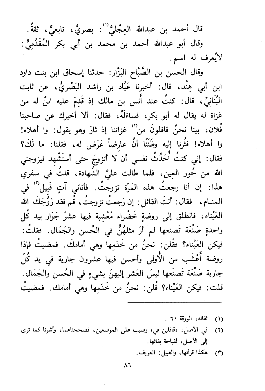 وَقَال الْحَسَن بْن الصباح البزار: حَدَّثَنَا إسحاق ابن بنت داود ابن أَبي هند، قال: أَخْبَرَنَا عباد بْن راشد البَصْرِيّ، عَنْ ثابت البناني، قال: كنت عند أنس بْن مالك إذ قدم عليه ابن له من غزاة له يقال له أَبُو بكر، فساءله، فقال: ألا أخبرك عَنْ صاحبنا فلان، بينا نحن قافلون من (2) غزاتنا إذ ثار وهو يقول: وا أهلاه! وا أهلاه! فثرنا إليه وظننا أن عارضا عرض له، فقلنا: ما لك؟ فقال: إني كنت أحدث نفسي أن لا أتزوج حتى استشهد فيزوجني اللَّه من حور العين، فلما طالت علي الشهادة، قلت فِي سفري هذا: إن أنا رجعت هذه المرة تزوجت.