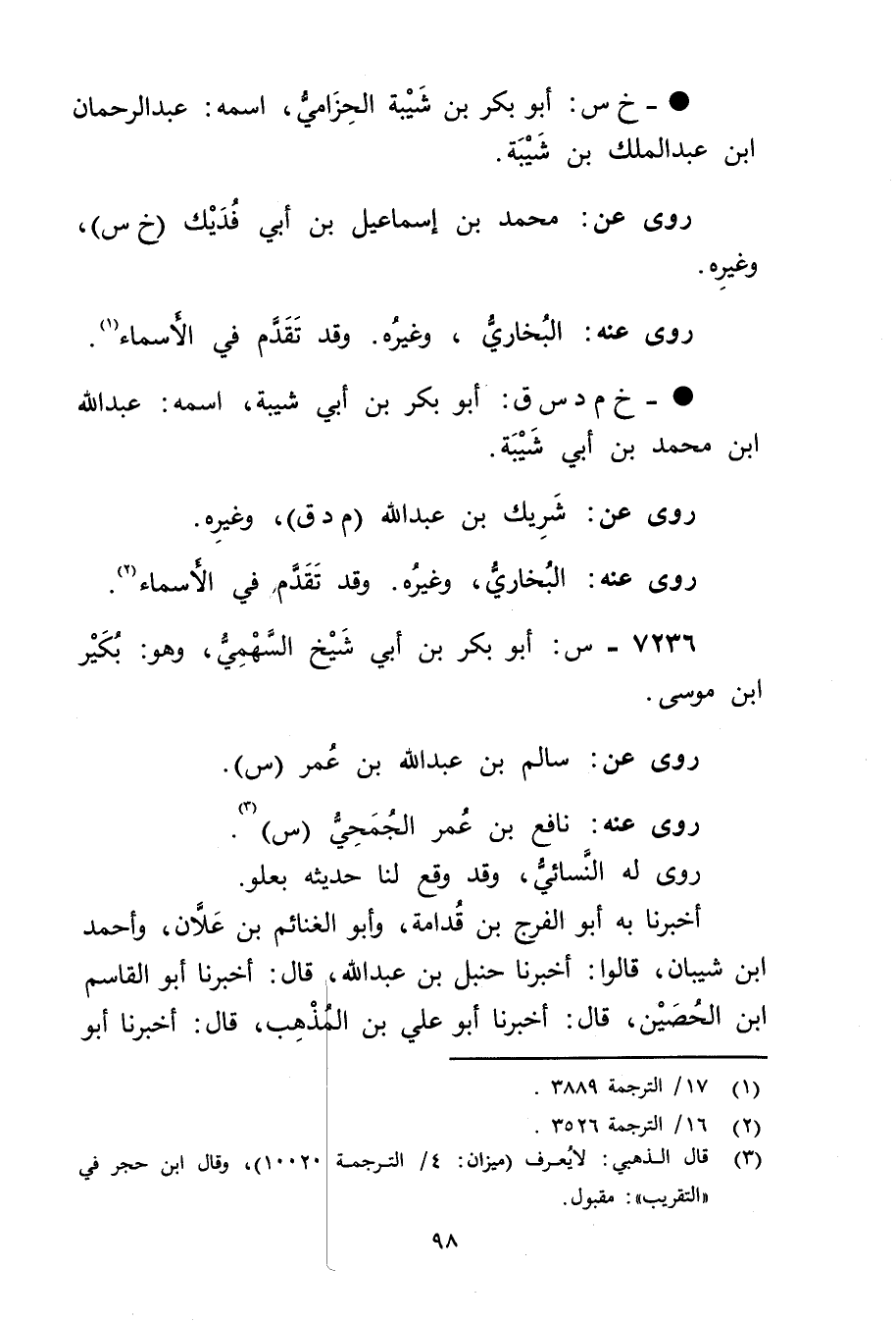 • خ م د س ق: أَبُو بكر بن أَبي شَيْبَة، اسمه: عَبد الله بْن مُحَمَّد بْن أَبي شَيْبَة.