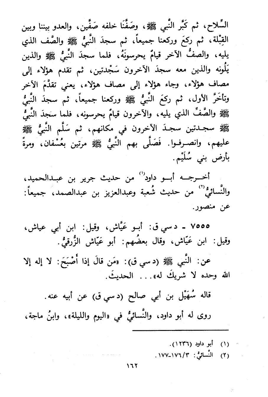 السِّلاحَ، ثُمَّ كَبَّرَ النَّبِيُّ صَلَّى اللَّهُ عَلَيْهِ وسَلَّمَ، وصَفَّنَا خَلْفَهُ صَفَّيْنِ، والْعَدُوُّ بَيْنَنَا وبَيْنَ الْقِبْلَةِ، ثُمَّ رَكَعَ ورَكَعْنَا جَمِيعًا، ثُمَّ سَجَدَ النَّبِيُّ صَلَّى اللَّهُ عَلَيْهِ وسَلَّمَ والصَّفُّ الَّذِي يَلِيهِ، والصَّفُّ الآخَرُ قِيَامٌ يَحْرُسُونَهُ، فَلَمَّا سَجَدَ النَّبِيُّ صلى الله عليه وسلم والَّذِينَ يَلُونَهُ والَّذِينَ مَعَهُ سَجَدَ الآخَرُونَ سَجْدَتَيْنِ، ثُمَّ تَقَدَّمَ هَؤُلاءِ إِلَى مَصَافِ هَؤُلاءِ، وجَاءَ هَؤُلاءِ إِلَى مَصَافِ هَؤُلاءِ، يَعْنِي تَقَدَّمَ الآخَرُ وتَأَخَّرَ الأَوَّلُ، ثُمَّ رَكَعَ النَّبِيُّ صلى الله عليه وسلم ورَكَعْنَا جَمِيعًا، ثُمَّ سَجَدَ النَّبِيُّ صَلَّى اللَّهُ عَلَيْهِ وسَلَّمَ والصَّفُّ الَّذِي يَلِيهِ، والآخَرُونَ قِيَامٌ يَحْرُسُونَهُ، فَلَمَّا سَجَدَ النَّبِيُّ صَلَّى اللَّهُ عَلَيْهِ وسَلَّمَ سَجْدَتَيْنِ سَجَدَ الآخَرُونَ فِي مَكَانِهِمْ، ثُمَّ سَلَّمَ النَّبِيُّ صَلَّى اللَّهُ عَلَيْهِ وسَلَّمَ عَلَيْهِمْ. وانْصَرَفُوا.