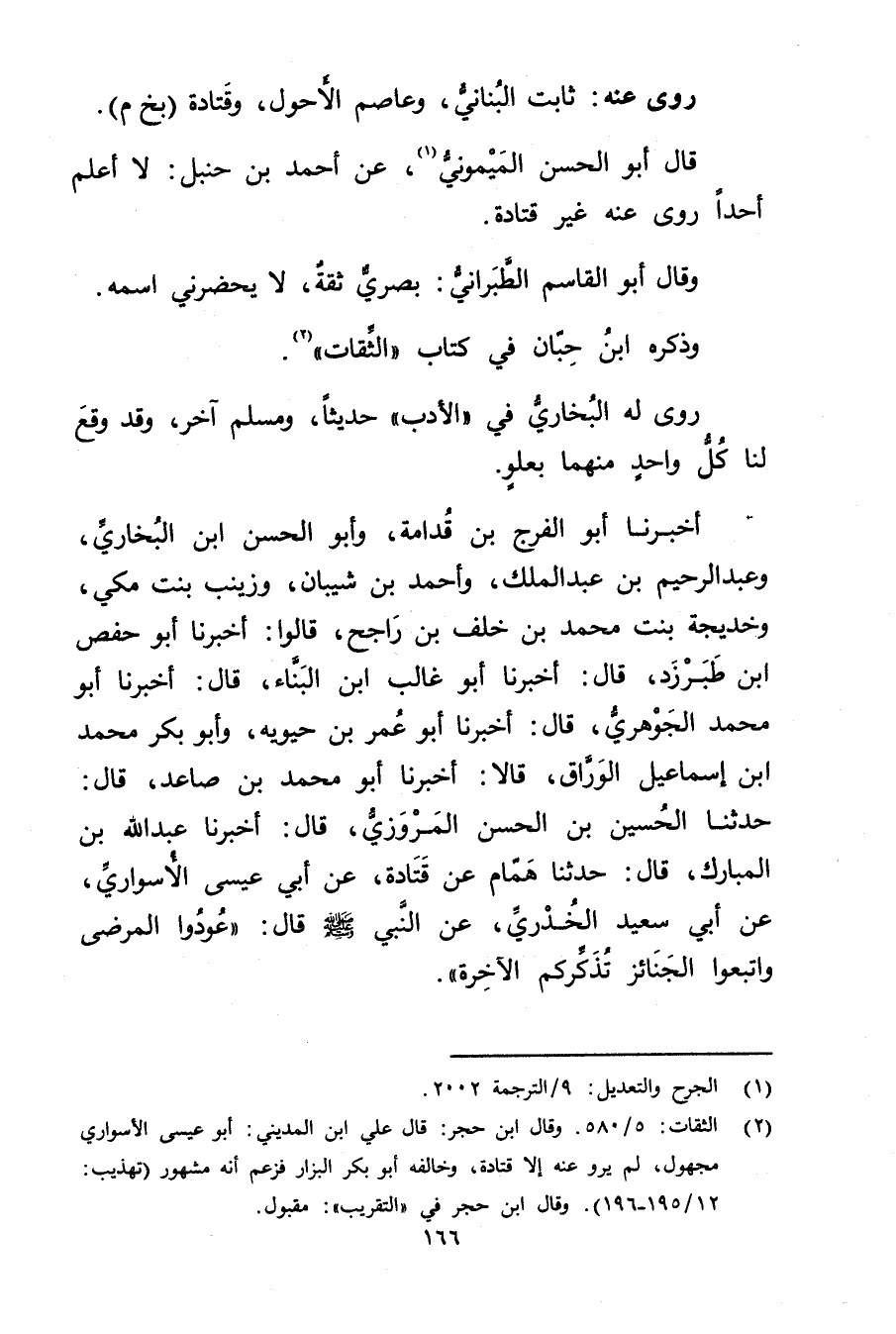 (2) الثقات: 5 / 580. وَقَال ابن حجر: قال علي ابن المديني: أبو عيسى الاسواري مجهول، لم يرو عنه إلا قتادة، وخالفه أبو بكر البزار فزعم أنه مشهور (تهذيب: 12 / 195 - 196) . وَقَال ابن حجر في "التقريب": مقبول.