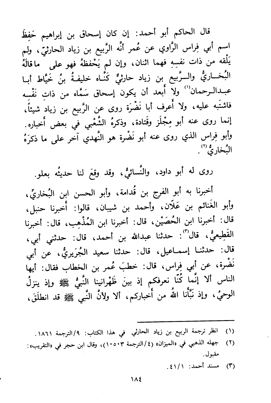 أخبرنا به أَبُو الْفَرَجِ بْنُ قُدَامَةَ، وأَبُو الْحَسَنُ بْنُ الْبُخَارِيِّ، وأَبُو الْغَنَائِمِ بْن علان، وأحمد بْن شيبان، قَالُوا: أخبرنا حنبل، قال: أخبرنا ابْنُ الْحُصَيْنِ، قال: أخبرنا ابْنُ الْمُذْهِب، قال: أخبرنا القَطِيعِيّ، قال (3) : حَدَّثَنَا عَبد اللَّهِ بْنُ أَحْمَدَ، قال: حَدَّثني أبي، قال: حَدَّثَنَا إِسْمَاعِيلُ، قال: حَدَّثَنَا سَعِيد الْجُرَيْرِيِّ، عَن أبي نضرة، عَن أبي فِرَاسٍ، قال: خَطَبَ عُمَر بْنُ الْخَطَّابِ فَقَالَ: أَيُّهَا النَّاسُ أَلا إِنَّمَا كُنَّا نَعْرِفُكُمْ إِذْ بَيْنَ ظَهْرَانِينَا النَّبِيُّ صَلَّى اللَّهُ عَلَيْهِ وسَلَّمَ وإِذْ يَنْزِلُ الْوَحْيُ، وإِذْ نَبَّأَنَا اللَّهُ مِنْ أَخْبَارِكُمْ، أَلا ولأَنَّ النَّبِيَّ صَلَّى اللَّهُ عَلَيْهِ وسلم قد انطلق،