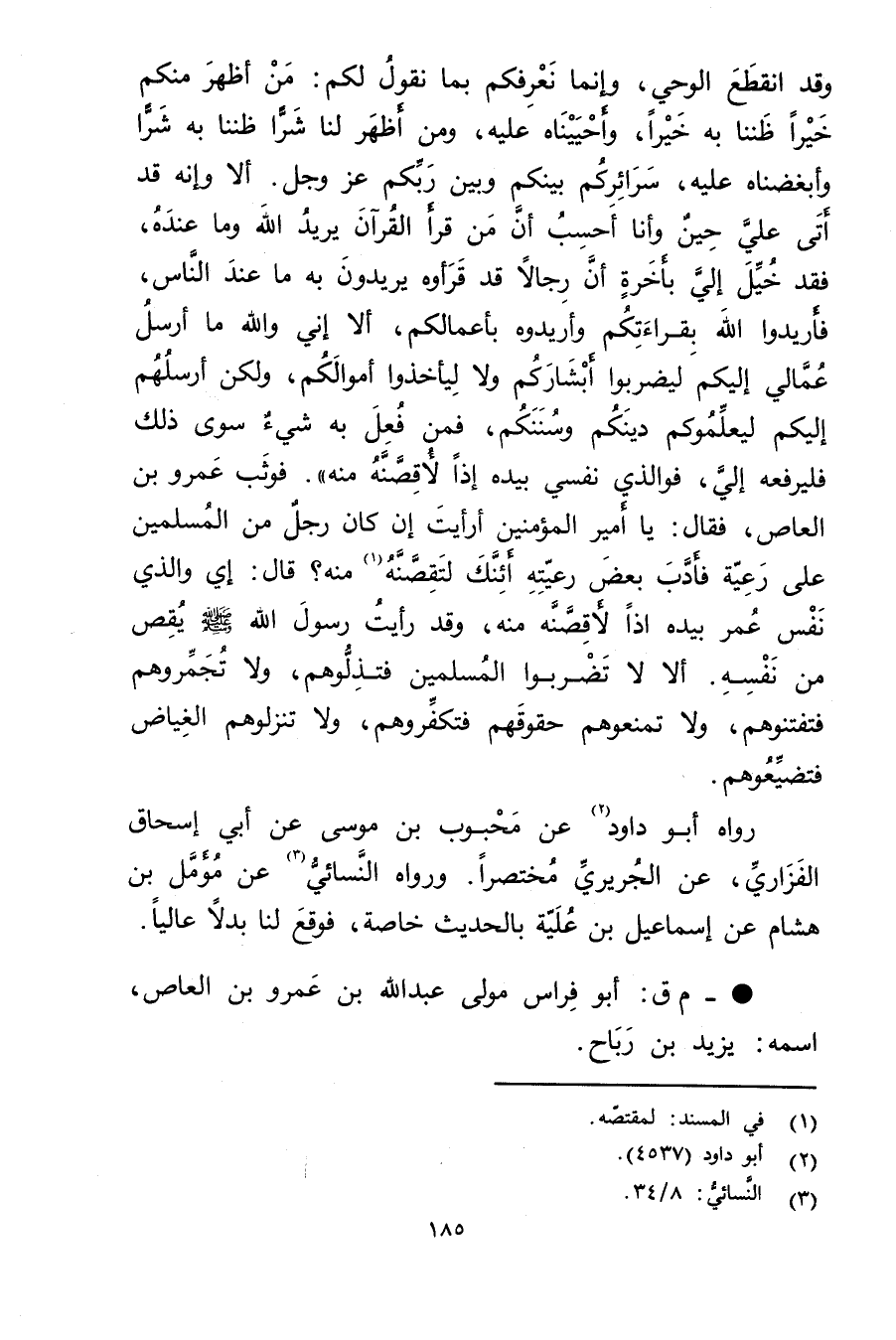 أَلا وإِنَّهُ قَدْ أَتَى عَلَيَّ حِينٌ وأَنَا أَحْسِبُ أَنَّ مَنْ قَرَأَ الْقُرْآنَ يُرِيدُ اللَّهَ ومَا عِنْدَهُ، فَقَدْ خُيِّلَ إِلَيَّ بأخرةٍ أَنَّ رِجَالا قَدْ قَرَأُوهُ يُرِيدُونَ بِهِ مَا عِنْدَ النَّاسِ، فَأَرِيدُوا اللَّهَ بِقِرَاءَتِكُمْ وأَرِيدُوهُ بِأَعْمَالِكُمْ، أَلا إِنِّي واللَّهِ مَا أُرْسِلُ عُمَّالِي إِلَيْكُمْ لِيَضْرِبُوا أَبْشَارَكُمْ ولا لِيَأْخُذُوا أَمْوَالَكُمْ، ولَكِنْ أُرْسِلُهُمْ إِلَيْكُمْ لِيُعَلِّمُوكُمْ دِينَكُمْ وسُنَنَكُمْ، فَمَنْ فُعِلَ بِهِ شَيْءٌ سُوَى ذَلِكَ فَلْيَرْفَعْهُ إِلَيَّ، فَوَالَّذِي نَفْسِي بِيَدِهِ إِذًا لأَقِصَّنَّهُ مِنْهُ". فَوَثَبَ عَمْرو بْنُ الْعَاصِ، فَقَالَ: يَا أَمِيرَ الْمُؤْمِنِينَ أَرَأَيْتَ إِنْ كَانَ رَجُلٌ مِنَ الْمُسْلِمِينَ عَلَى رَعِيَّةٍ فَأَدَّبَ بَعْضَ رَعِيَّتِهِ أَئِنَّكَ لَتَقِصَّنَّهُ (1) مِنْهُ؟. قال: إِي والَّذِي نَفْسُ عُمَر بِيَدِهِ إِذًا لأَقِصَّنَّهُ مِنْهُ، وقَدْ رَأَيْتُ رَسُولَ اللَّهِ صلى الله عليه وسلم يُقِصُّ مِنْ نَفْسِهِ. أَلا لا تَضْرِبُوا الْمُسْلِمِينَ فَتُذِلُّوهُمْ، ولا تُجَمِّرُوهُمْ فَتَفْتِنُوهُمْ، ولا تَمْنَعُوهُمْ حُقُوقَهُمْ فَتُكَفِّرُوهُمْ، ولا تُنْزِلُوهُمُ الْغِيَاضَ فَتُضَيِّعُوهُمْ.