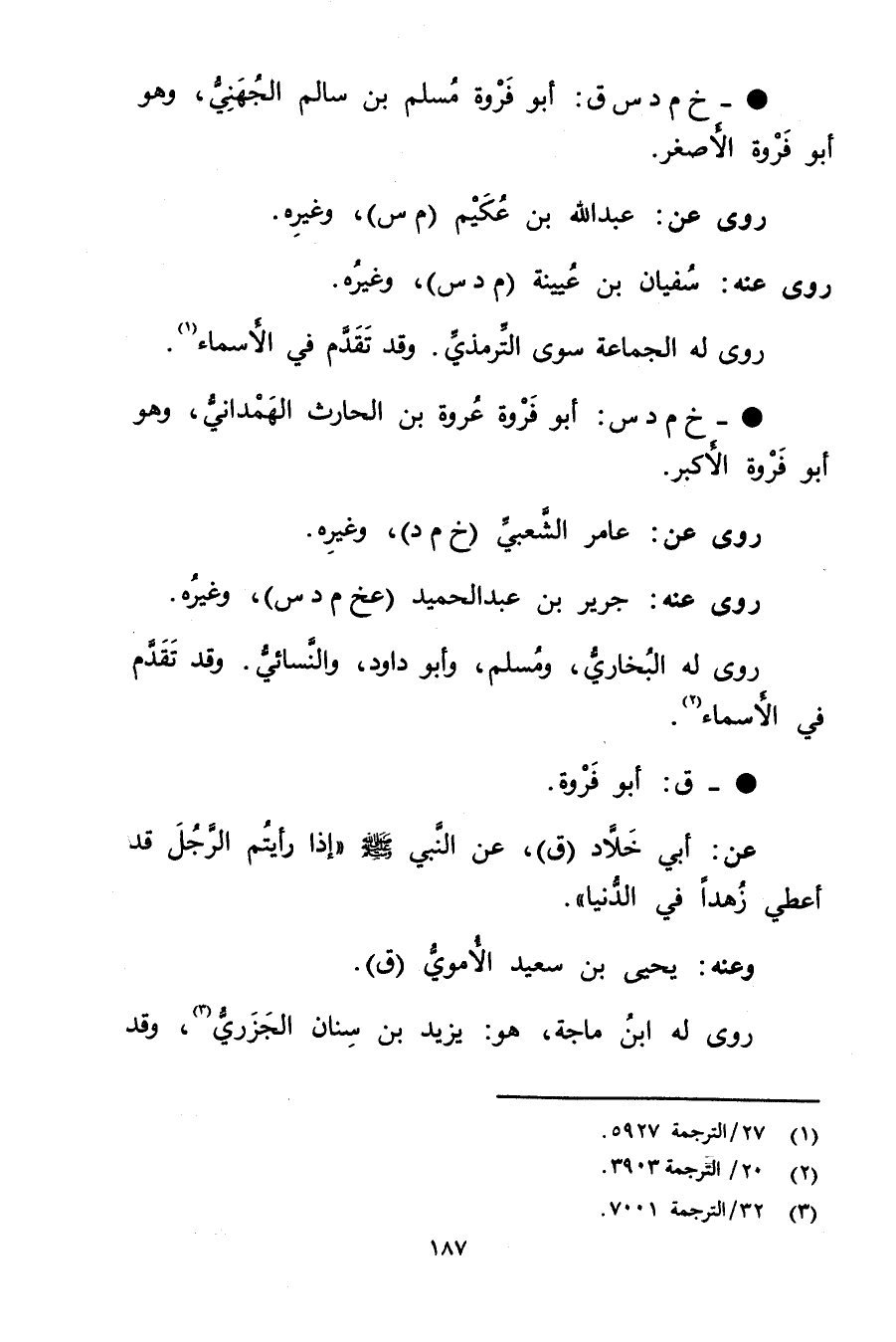 • - خ م د س ق: أَبُو فَرْوَةَ مُسْلِمُ بْنُ سَالِمٍ الجهني، وهو أَبُو فروة الأصغر.