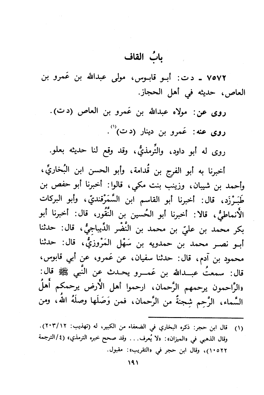 أخبرنا بِهِ أَبُو الْفَرَجِ بْنُ قُدَامَةَ، وأبو الْحَسَن بْن الْبُخَارِيّ، وأحمد بْن شَيْبَانَ، وزينب بنت مكي، قَالُوا: أَخْبَرَنَا أَبُو حفص بْن طَبَرْزَذَ، قال: أَخْبَرَنَا أَبُو الْقَاسِمِ ابْنُ السَّمَرْقَنْدِيِّ، وأَبُو الْبَرَكَاتِ الأَنْمَاطِيُّ، قَالا: أخبرنا أَبُو الحسين بْن النقور، قال: أخبرنا أَبُو بكر مُحَمَّد بْن علي بْن مُحَمَّد بْن النضر الديباجي، قال: حَدَّثَنَا أَبُو نصر مُحَمَّد بْن حمدويه بْن سَهْلٍ الْمَرْوَزِيُّ، قال: حَدَّثَنَا مَحْمُودُ بْن آدم، قال: حَدَّثَنَا سفيان، عَنْ عَمْرو، عَن أَبِي قَابُوسَ، قال: سَمِعْتُ عَبد اللَّهِ بْنَ عَمْرو يُحَدِّثُ عَنِ النَّبِيِّ صَلَّى اللَّهُ عَلَيْهِ وَسَلَّمَ قال: الرَّاحِمُونَ يَرْحَمُهُمُ الرَّحْمَنُ، ارْحَمُوا أَهْلَ الأَرْضِ يَرْحَمُكُمْ أَهْلُ السَّمَاءِ، الرَّحِمُ شِجْنَةٌ مِنَ الرَّحْمَنِ، فَمَنْ وصَلَهَا وصَلَهُ الله، ومن
