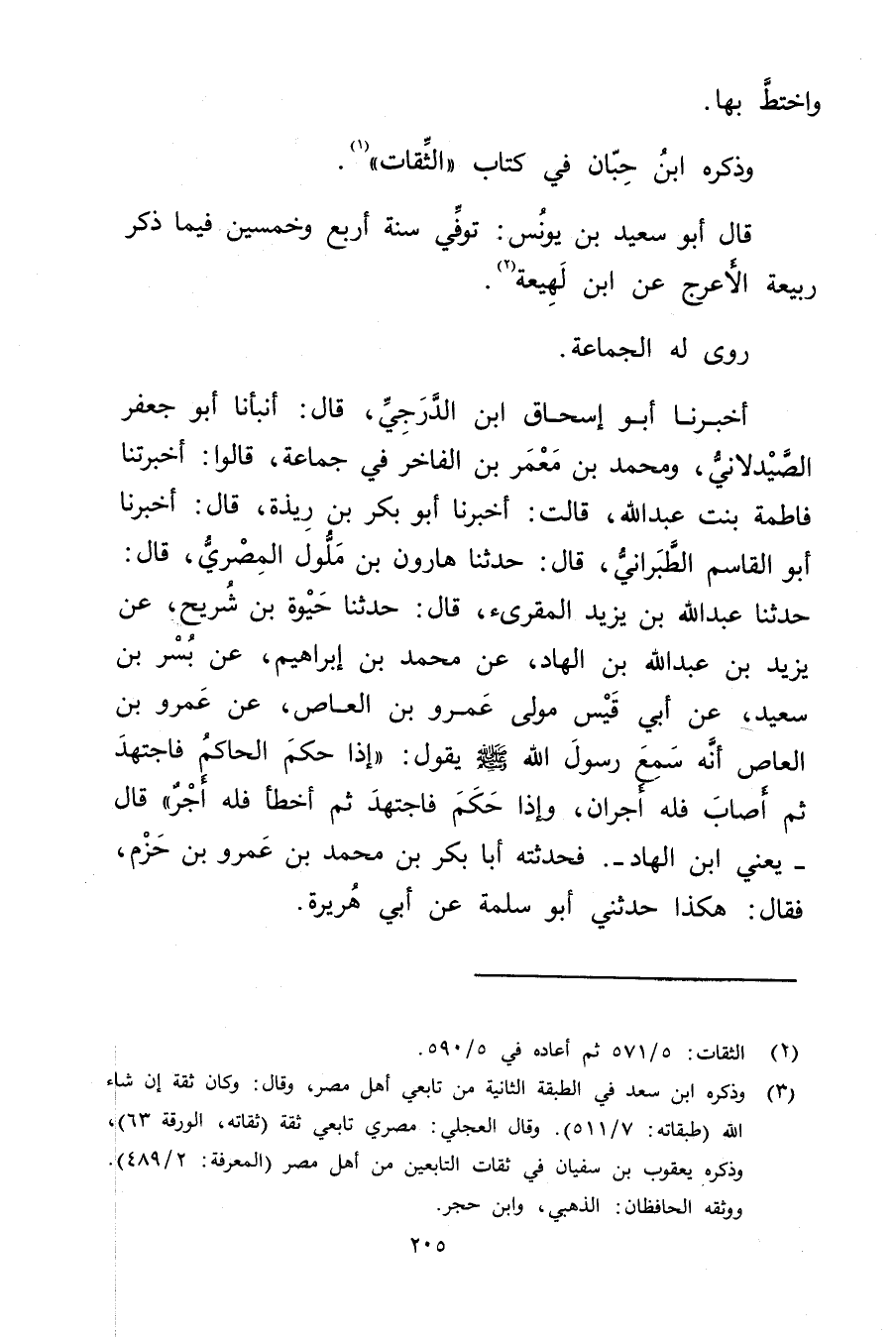 أَخْبَرَنَا أَبُو إسحاق ابْنُ الدَّرَجِيِّ، قال: أَنْبَأَنَا أَبُو جَعْفَرٍ الصَّيْدَلانِيُّ، ومُحَمَّدُ بْنُ مَعْمَرِ بْنِ الْفَاخِرِ فِي جَمَاعَةٍ، قَالُوا: أَخْبَرَتْنا فَاطِمَةُ بِنْتُ عَبد اللَّهِ، قَالَتْ: أخبرنا أَبُو بَكْرِ بْنُ رِيذَةَ، قال: أخبرنا أَبُو الْقَاسِمِ الطَّبَرَانِيُّ، قال: حَدَّثَنَا هَارُونُ بْنُ مَلُّولٍ المِصْرِي، قال: حَدَّثَنَا عَبد اللَّه بْن يزيد المقرئ، قال: حَدَّثَنَا حَيْوَةُ بْنُ شُرَيْحٍ، عَنْ يزيد بْن عَبد الله بْن الْهَادِ، عَنْ مُحَمَّدِ بْنِ إِبْرَاهِيمَ، عَنْ بُسْرِ بْنِ سَعِيد، عَن أَبِي قَيْسٍ مَوْلَى عَمْرو بْنِ العاص، عن عَمْرو بْن العاص أَنَّهُ سَمِعَ رَسُولَ اللَّهِ صَلَّى اللَّهُ عَلَيْهِ وسَلَّمَ يَقُولُ: إِذَا حَكَمَ الْحَاكِمُ فَاجْتَهَدَ ثُمَّ أَصَابَ فَلَهُ أَجْرَانِ، وإِذَا حَكَمَ فَاجْتَهَدَ ثُمَّ أَخْطَأَ فَلَهُ أَجْرٌ" قال، يعني ابن الهاد -. فحدثته أبا بكر بْن مُحَمَّد بْن عَمْرو بْن حزم، فَقَالَ: هكذا حَدَّثَنِي أَبُو سَلَمَةَ عَن أَبِي هُرَيْرة.