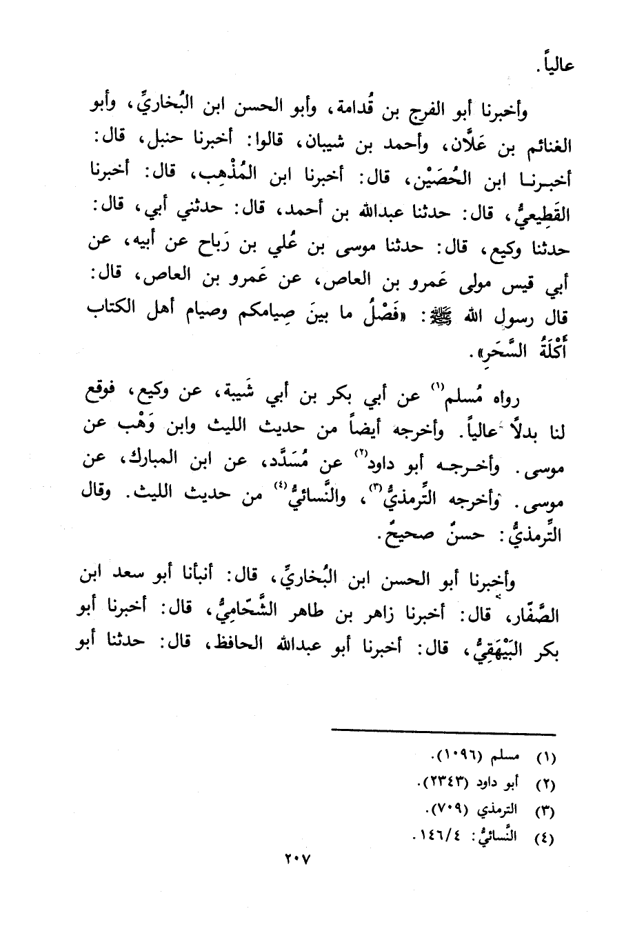 وأَخْبَرَنَا أَبُو الْفَرَجِ بْن قُدَامَةَ، وأَبُو الْحَسَنِ بْنُ الْبُخَارِيِّ، وأبو الغنائم بْن علان، وأحمد بْنُ شَيْبَانَ، قَالُوا: أَخْبَرَنَا حَنْبَلُ، قال: أخبرنا ابن الحصين، قال: أخبرنا ابْنُ الْمُذْهِب، قال: أخبرنا القَطِيعِيّ، قال: حَدَّثَنَا عَبد الله بْن أَحْمَدَ، قال: حَدَّثني أبي، قال: حَدَّثَنَا وكِيعٌ، قال: حَدَّثَنَا مُوسَى بْنُ عَلِيِّ بْنِ رَبَاحٍ عَن أَبِيهِ، عَن أَبِي قَيْسٍ مولى عَمْرو بْن العاص، عن عَمْرو بْنُ الْعَاصِ، قال: قال رَسُول اللَّهِ صلى الله عليه وسَلَّمَ: فَصْلُ مَا بَيْنَ صِيَامِكُمْ وصِيَامِ أَهْلِ الْكِتَابِ أَكْلَةُ السَّحَرِ.