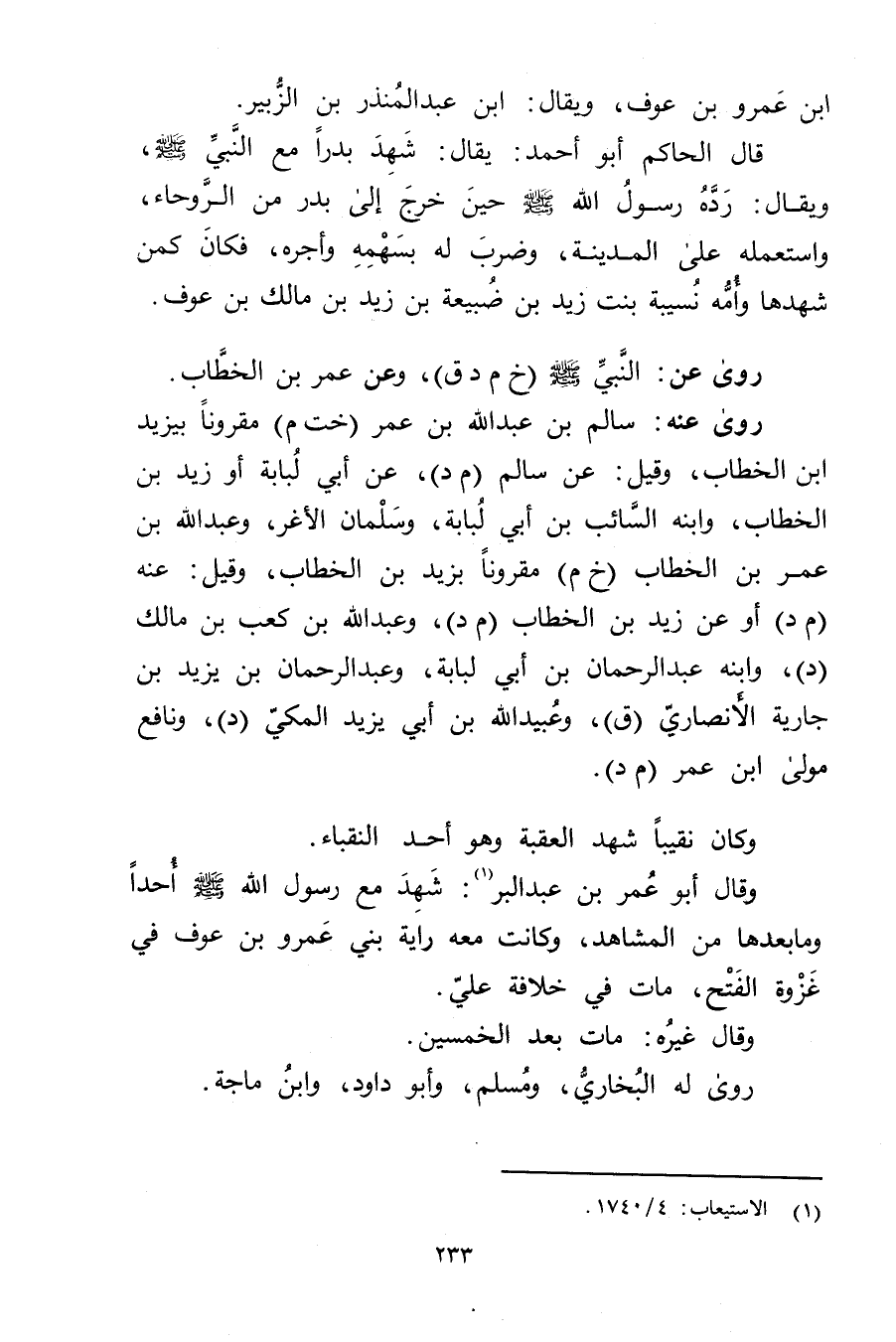 وَقَال أَبُو عُمَر بْن عَبد الْبَرِّ (1) : شهد مع رَسُول اللَّهِ صَلَّى اللَّهُ عليه وسلم أحدا وما بعدها من المشاهد، وكانت معه راية بني عَمْرو بْن عوف فِي غزوة الفتح، مات فِي خلافة علي.
