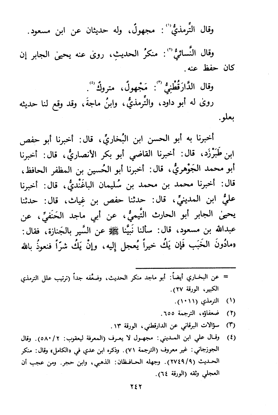 أَخْبَرَنَا بِهِ أَبُو الْحَسَنِ بْن البخاري، قال: أَخْبَرَنَا أبو حفص ابن طَبَرْزَذَ، قال: أخبرنا الْقَاضِي أَبُو بَكْرٍ الأَنْصارِيّ، قال: أخبرنا أَبُو مُحَمَّدٍ الجوهري، قال: أخبرنا أَبُو الحسين بْن المظفر الحافظ، قال: أخبرنا مُحَمَّد بْن مُحَمَّد بْن سُلَيْمان الباغندي، قال: أخبرنا علي ابن الْمَدِينِيِّ، قال: حَدَّثَنَا حَفْصُ بْنُ غِيَاثٍ، قال: حَدَّثَنَا يَحْيَى الْجَابِرُ أَبُو الْحَارِثِ التَّيْمِيّ، عَن أَبِي مَاجِدٍ الْحَنَفِيِّ، عَنْ عَبد اللَّهِ بْنِ مَسْعُودٍ، قال: سَأَلْنَا نَبِيِّنَا صَلَّى اللَّهُ عَلَيْهِ وسَلَّمَ عَن السَّيْرِ بِالْجَنَازَةِ، فَقَالَ: مَا دُونَ الْخَبَبِ فَإِنْ يَكُ خَيْرًا يُعْجَلْ إِلَيْهِ، وإِنْ يَكُ شَرًّا فَنَعُوذُ بالله