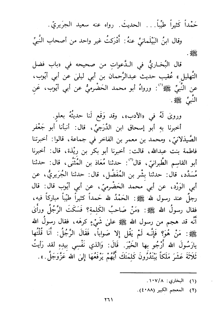 أَخْبَرَنَا بِهِ أَبُو إِسْحَاقَ ابْنُ الدَّرَجِيِّ، قال: أنبأنا أَبُو جَعْفَرٍ الصَّيْدَلانِيُّ، ومُحَمَّدُ بْنُ مَعْمَرِ بْنِ الْفَاخِرِ فِي جَمَاعَةٍ، قَالُوا: أَخْبَرَتْنَا فَاطِمَةُ بِنْتُ عَبد اللَّهِ، قَالَتْ: أخبرنا أَبُو بَكْرِ بْنُ رِيذَةَ، قال: أخبرنا أَبُو الْقَاسِمِ الطَّبَرَانِيُّ، قال (2) : حَدَّثَنَا مُعَاذُ بْنُ الْمُثَنَّى، قال: حَدَّثَنَا مُسَدَّدٌ، قال: حَدَّثَنَا بِشْرُ بْنُ الْمُفَضَّلِ، قال: حَدَّثَنَا الْجُرَيْرِيُّ، عَن أَبِي الْوَرْدِ، عَن أَبِي مُحَمَّد الحضرمي، عَن أَبِي أَيُّوبَ قال: قال رَجُلٌ عِنْدَ رَسُول اللَّهِ صلى الله عليه وسَلَّمَ: الحمد لله حمدا كثيرا طَيِّبًا مُبَارَكًا فِيهِ، فَقَالَ رَسُولُ اللَّهِ صلى الله عليه وسلم: مَنْ صَاحِبُ الْكَلِمَةِ؟ فَسَكَتَ الرَّجُلُ ورَأَى أَنَّهُ قَدْ هَجَمَ مِنْ رَسُول اللَّهِ صلى الله عليه وسَلَّمَ عَلَى شَيْءٍ كَرِهَهُ، فَقَالَ رَسُول اللَّهِ صلى الله عليه وسَلَّمَ: مَنْ هُوَ؟ فَإِنَّهُ لَمْ يَقُلْ إِلا صَوَابًا، فَقَالَ الرَّجُلُ: أَنَا قُلْتُهَا يَا رَسُولَ اللَّهِ أَرْجُو بِهَا الْخَيْرَ. قال: والَّذِي نَفْسِي بِيَدِهِ لَقَدْ رَأَيْتُ ثَلاثَةَ عَشَرَ مَلَكًا يَبْتَدِرُونَ كَلِمَتَكَ أَيُّهُمْ يرفعها إلى الله عزوجل.