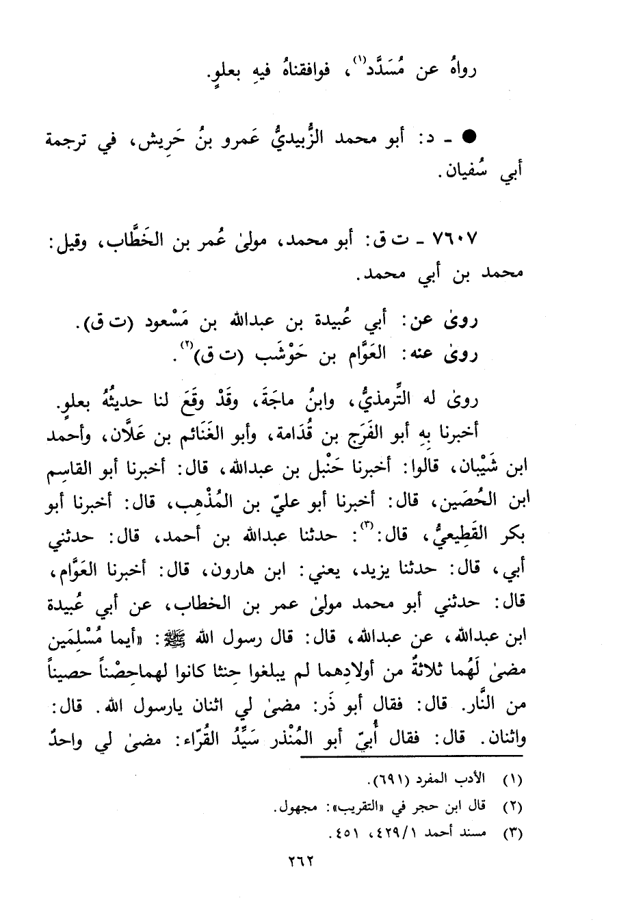 أخبرنا به أَبُو الْفَرَجِ بْنُ قُدَامَةَ، وأَبُو الْغَنَائِمِ بْن علان، وأحمد بْن شيبان، قالوا: أَخْبَرَنَا حنبل بْن عَبد اللَّهِ، قال: أخبرنا أَبُو الْقَاسِمِ ابن الحصين، قال: أخبرنا أَبُو علي بْن المذهب، قال: أَخْبَرَنَا أَبُو بَكْرٍ القَطِيعِيّ، قال: (3) : حَدَّثَنَا عَبد اللَّهِ بْن أَحْمَدَ، قال: حَدَّثني أَبِي، قال: حَدَّثَنَا يَزِيدُ، يَعْنِي: ابْنَ هَارُونَ، قال: أَخْبَرَنَا الْعَوَّامُ، قال: حَدَّثَنِي أَبُو مُحَمَّدٍ مَوْلَى عُمَر بْنِ الْخَطَّابِ، عَن أبي عُبَيدة ابن عَبد اللَّه، عَنْ عَبد اللَّهِ، قال: قال رَسُولُ اللَّهِ صَلَّى اللَّهُ عَلَيْهِ وسَلَّمَ: أَيُّمَا مُسْلِمَيْنِ مَضَى لَهُمَا ثَلاثَةٌ مِنْ أَوْلادِهِمَا لَمْ يَبْلُغُوا حِنْثًا كَانُوا لَهُمَا حِصْنًا حَصِينًا مِنَ النَّارِ. قال: فَقَالَ أَبُو ذَرٍّ: مَضَى لِي اثْنَانِ يَا رَسُولَ اللَّهِ. قال: واثْنَانِ. قال: فَقَالَ أُبَيٌّ أَبُو الْمُنْذِرِ سَيِّدُ الْقُرَّاءِ: مَضَى لي واحد