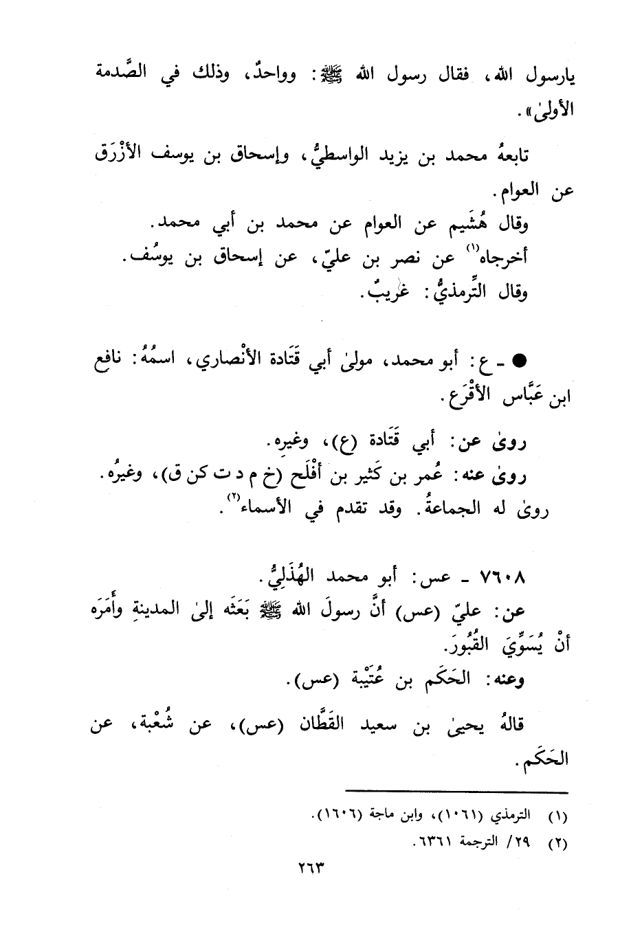 عَن: علي (عس) أَنَّ رَسُولَ اللَّهِ صلى الله عليه وسلم بعثه إِلَى المدينة وأمره أن يسوي القبور.
