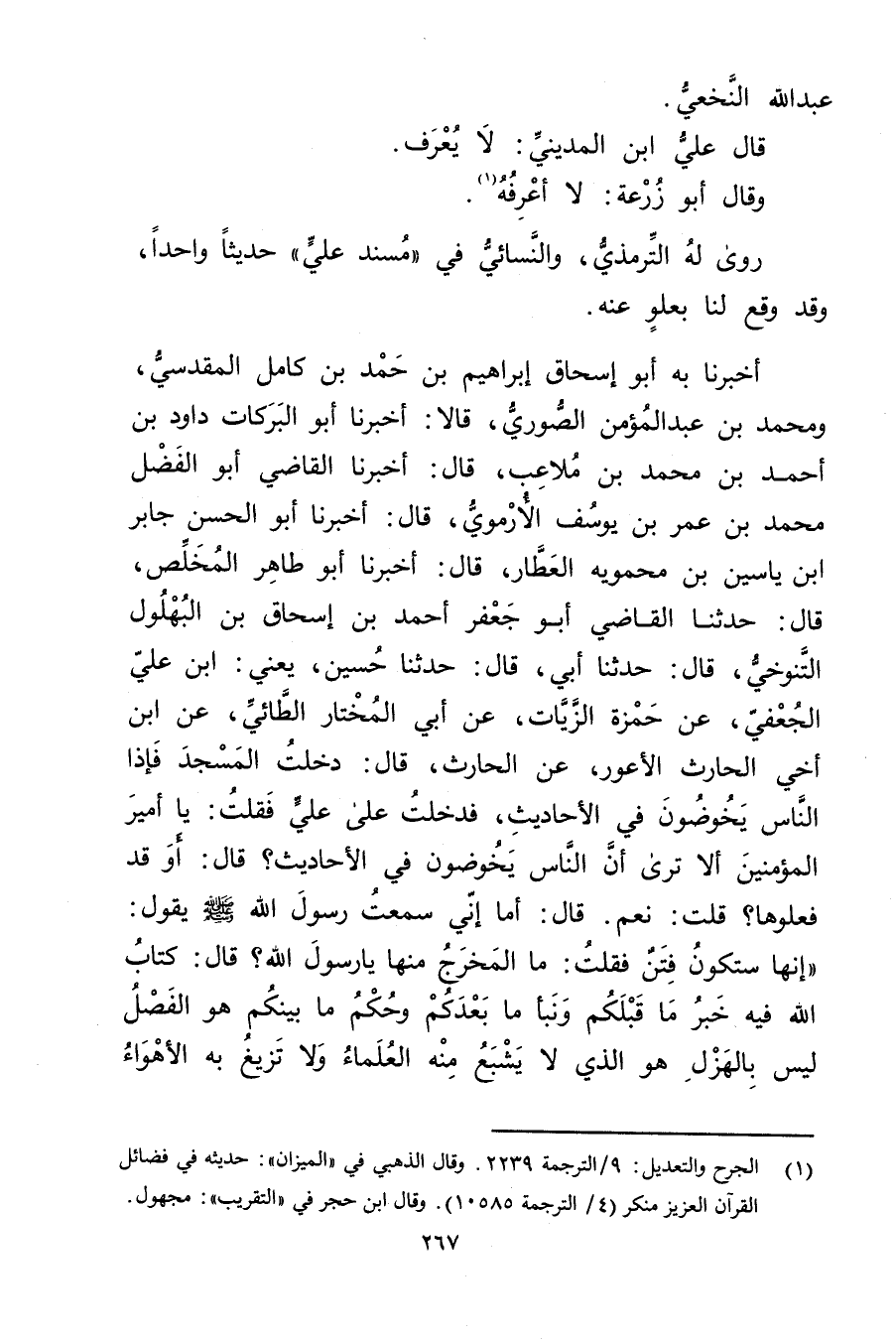 أَخْبَرَنَا بِهِ أَبُو إِسْحَاقَ إِبْرَاهِيمُ بْنُ حَمْدِ بْنِ كَامِلٍ الْمَقْدِسِيُّ، ومحمد بن عبد المؤمن الصوري، قالا: أخبرنا أَبُو البركات دَاوُدُ بْنُ أَحْمَدَ بْنِ مُحَمَّدِ بْن ملاعب، قال: أَخْبَرَنَا القاضي أَبُو الْفَضْلِ مُحَمَّدُ بْنُ عُمَر بْنِ يُوسُفَ الأُرْمَوِيُّ، قال: أَخْبَرَنَا أبو الحسن جابر ابن يَاسِينَ بْنِ مَحْمَوَيْهِ الْعَطَّارُ، قال: أَخْبَرَنَا أَبُو طَاهِرٍ الْمُخَلَّصِ، قال: حَدَّثَنَا الْقَاضِي أَبُو جَعْفَرٍ أَحْمَدُ بْن إِسْحَاقَ بْن البهلول التنوخي، قال: حَدَّثَنَا أَبِي، قال: حَدَّثَنَا حُسَيْنٌ، يَعْنِي: ابْنَ عَلِيٍّ الْجُعْفِيَّ، عَنْ حَمْزَةَ الزَّيَّاتِ، عَن أَبِي الْمُخْتَارِ الطَّائِيِّ، عَنِ ابْنِ أَخِي الْحَارِثِ الأَعور، عَنِ الْحَارِثِ، قال: دَخَلْتُ الْمَسْجِدَ فَإِذَا النَّاسُ يَخُوضُونَ فِي الأَحَادِيثِ، فَدَخَلْتُ عَلَى عَلِيٍّ فَقُلْتُ: يَا أَمِيرَ الْمُؤْمِنِينَ أَلا تَرَى أَنَّ النَّاسَ يَخُوضُونَ فِي الأَحَادِيثِ؟ قال: أَوَ قَدْ فَعَلُوهَا؟ قُلْتُ: نَعَمْ. قال: أَمَا إِنِّي سمعت رَسُول اللَّهِ صَلَّى اللَّهُ عَلَيْهِ وسَلَّمَ يَقُولُ: إِنَّهَا سَتَكُونُ فِتَنٌ فَقُلْتُ: مَا الْمَخْرَجُ مِنْهَا يَا رَسُولَ اللَّهِ؟ قال: كِتَابُ اللَّهِ فِيهِ خَبْرُ مَا قَبْلَكُمْ ونَبَأُ مَا بَعْدَكُمْ وحُكْمُ مَا بَيْنَكُمْ هُوَ الْفَصْلُ لَيْسَ بِالْهَزْلِ هُوَ الَّذِي لا يَشْبَعُ مِنْهُ العلماء ولا تزيع به الاهواء