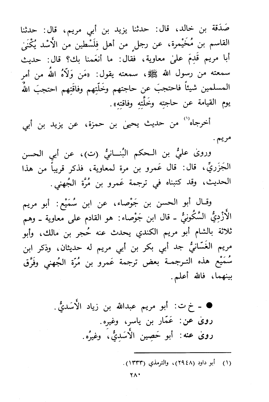صَدَقَةُ بْنُ خَالِدٍ، قال: حَدَّثَنَا يَزِيدَ بْنَ أَبي مَرْيَمَ، قال: حَدَّثَنَا الْقَاسِمُ بْنُ مُخَيْمِرَةَ، عَنْ رجل من أهل فلسطين من الأَسْدِ يُكْنَى أَبَا مَرْيَمَ قَدِمَ عَلَى مُعَاوِيَةَ، فَقَالَ: مَا أَنْعَمْنَا بِكَ؟ قال: حَدِيثٌ سَمِعْتُهُ مِنْ رَسُول اللَّهِ صلى الله عليه وسَلَّمَ، سَمِعْتُهُ يَقُولُ: مَنْ ولاهُ اللَّهُ مِنْ أَمْرِ الْمُسْلِمِينَ شَيْئًا فَاحْتَجَبَ عَنْ حَاجَتِهِمْ وخَلَّتِهِمْ وفَاقَتِهِمُ احْتَجَبَ اللَّهُ يَوْمَ الْقِيَامَةِ عَنْ حَاجَتِهِ وخَلَّتِهِ وفَاقَتِهِ.