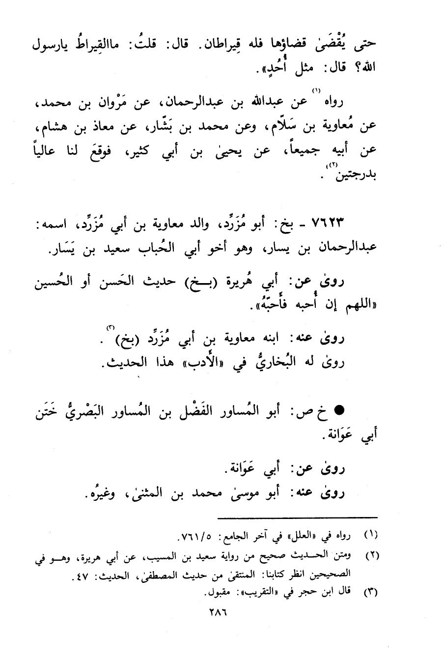 7623 - بخ: أَبُو مزرد، والد معاوية بْن أَبي مزرد، اسمه: عبد الرحمن بْن يسار، وهو أخو أَبِي الحباب سَعِيد بْن يسار.