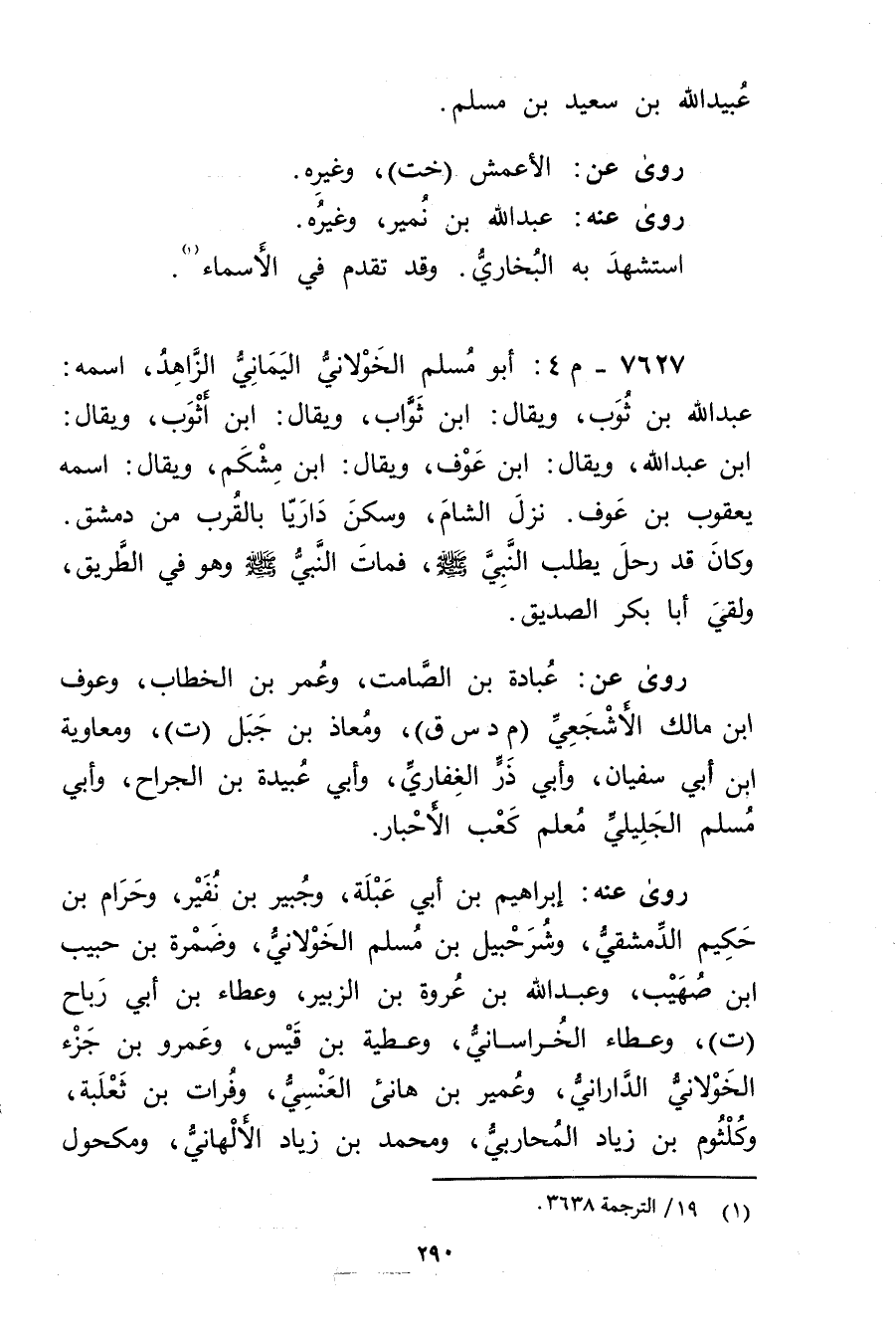 7627 - م 4: أَبُو مسلم الخولاني اليماني الزاهد، اسمه: عَبد اللَّه بْن ثوب، ويُقال: ابن ثواب، ويُقال: ابن أثوب، ويُقال: ابن عَبد اللَّه، ويُقال: ابن عوف، ويُقال: ابن مشكم، ويُقال: اسمه يعقوب بْن عوف. نزل الشام، وسكن داريا بالقرب من دمشق. وكان قد رحل يطلب النبي صَلَّى اللَّهُ عليه وسلم، فمات النَّبِيُّ صلى الله عليه وسلم وهو فِي الطريق، ولقي أبا بكر الصديق.