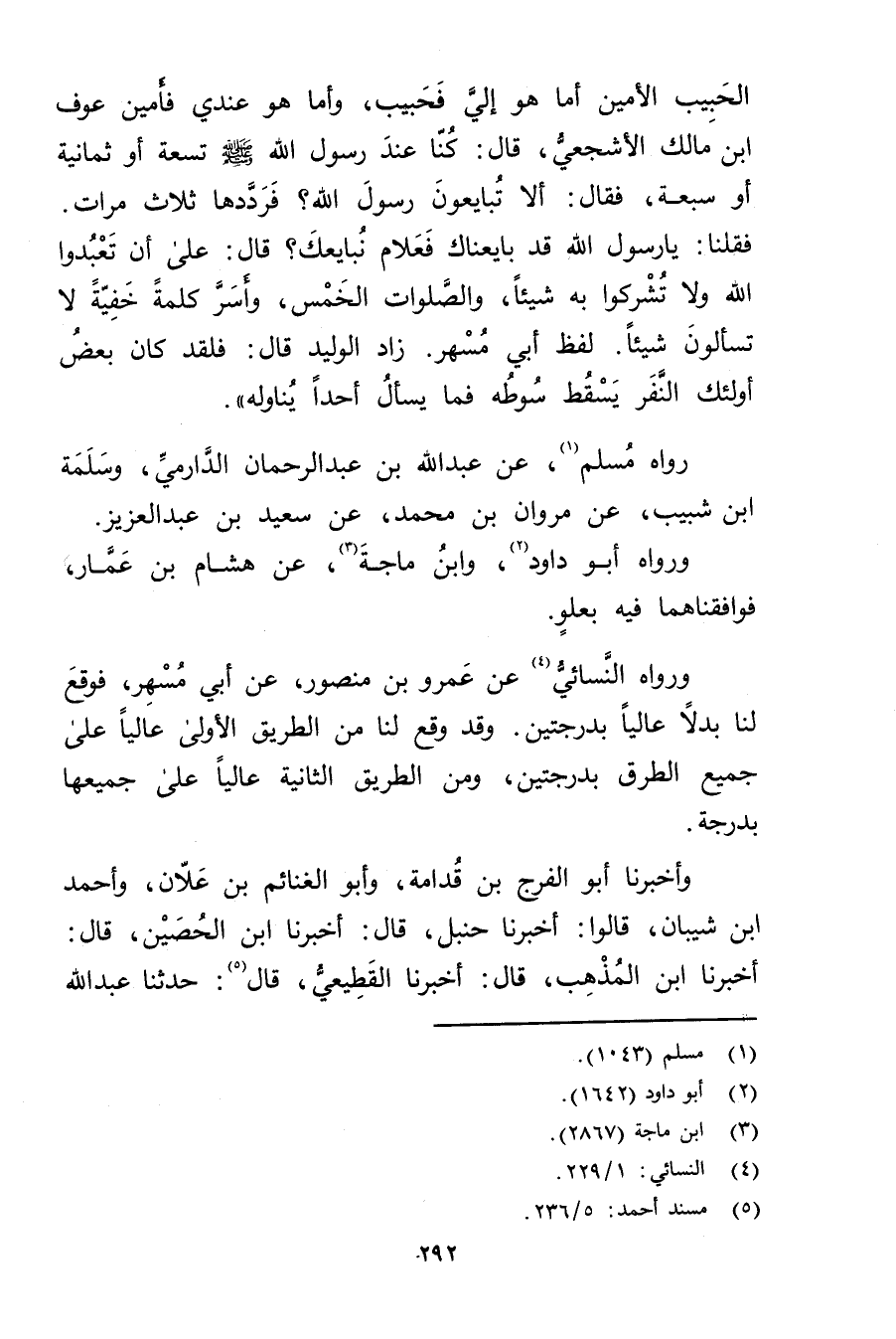 الْحَبِيبُ الأَمِينُ أَمَا هُوَ إِلَيَّ فَحَبِيبٌ، وأَمَا هُوَ عِنْدِي فَأَمِينٌ عوف ابن مَالِكٍ الأَشْجَعِيُّ، قال: كُنَّا عِنْدَ رَسُول اللَّهِ صلى الله عليه وسَلَّمَ تِسْعَةً أَوْ ثَمَانِيَةً أَوْ سَبْعَةً، فَقَالَ: أَلا تُبَايِعُونَ رَسُولَ اللَّهِ؟ فَرَدَّدَهَا ثَلاثَ مَرَّاتٍ. فَقُلْنَا: يارسول اللَّهِ قَدْ بَايَعْنَاكَ فَعَلامَ نُبَايِعُكَ؟ قال: عَلَى أَنْ تَعْبُدُوا اللَّهَ ولا تُشْرِكُوا بِهِ شَيْئًا، والصَّلَوَاتِ الْخَمْسِ، وأَسَرَّ كَلِمَةً خَفِيَّةً لا تَسْأَلُونَ شَيْئًا. لفظ أَبِي مسهر.