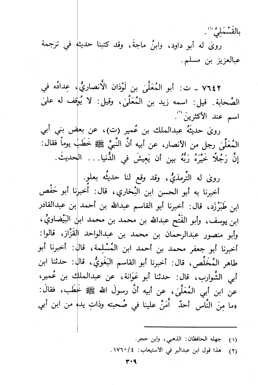 7642 - ت: أَبُو المعلى بن لوذان الأَنْصارِيّ، عداده فِي الصحابة. قِيلَ: اسمه زيد بْن المعلى، وقيل: لا يوقف لَهُ عَلَى اسم عند الأكثرين (2) .