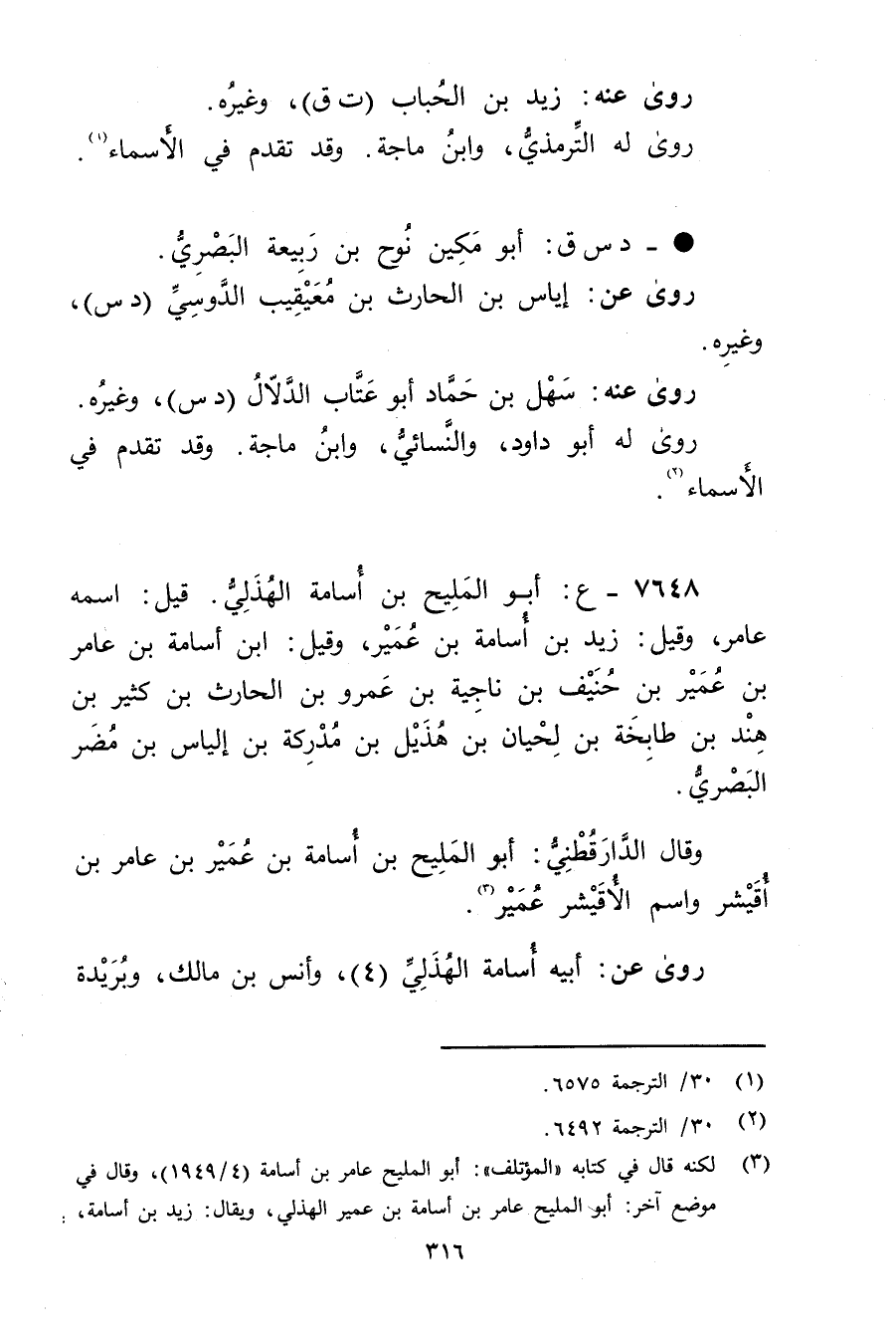 7648 - ع: أَبُو المليح بن أسامة الهذلي. قِيلَ: اسمه عامر، وقيل: زيد بْن أسامة بْن عُمَير، وقيل: ابن أسامة بْن عامر بْن عُمَير بْن حنيف بْن ناجية بْن عَمْرو بْن الحارث بْن كثير بْن هند بْن طابخة بْن لحيان بْن هذيل بن مدركة بن إلياس بن مضر البَصْرِيّ.