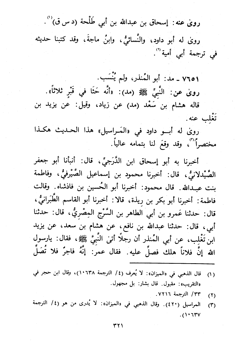 أَخْبَرَنَا بِهِ أَبُو إِسْحَاقَ ابْنُ الدَّرَجِيِّ، قال: أَنْبَأَنَا أَبُو جَعْفَرٍ الصَّيْدَلانِيُّ، قال: أَخْبَرَنَا مَحْمُودُ بْنُ إِسْمَاعِيلَ الصَّيْرَفِيُّ، وفَاطِمَةُ بنت عَبد الله. قال محمود: أَخْبَرَنَا أَبُو الْحُسَيْنِ بْنُ فَاذْشَاهِ. وَقَالت فَاطِمَةُ: أخبرنا أَبُو بَكْرٍ بْنُ رِيذَةَ، قَالا: أخبرنا أَبُو الْقَاسِمِ الطَّبَرَانِيُّ، قال: حَدَّثَنَا عَمْرو بن أَبي الطاهر بن السرج المِصْرِي، قال: حَدَّثَنَا أَبِي، قال: حَدَّثَنَا عَبد اللَّهِ بْنُ نَافِعٍ، عَنْ هِشَامِ بْنِ سَعْدٍ، عَنْ يَزِيدَ ابْنِ تَغْلِبَ، عَن أَبِي الْمُنْذِرِ أَنَّ رَجُلا أَتَى النَّبِيَّ صلى الله عليه وسلم، فَقَالَ: يَا رَسُولَ اللَّهِ إِنَّ فُلانًا هَلَكَ فصلِّ عَلَيْهِ. فَقَالَ عُمَر: إنه فاجر فلا تصل