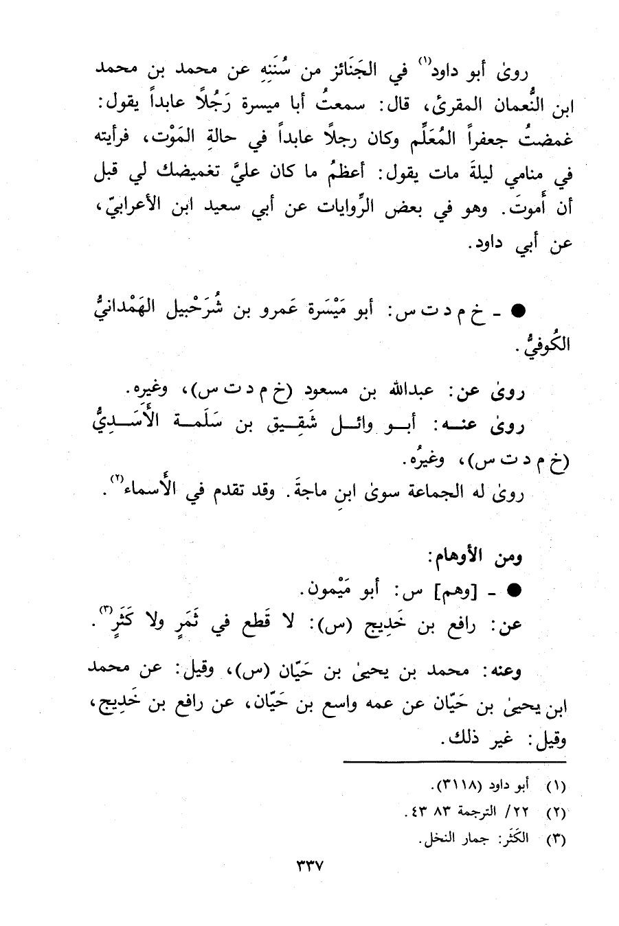 روى أَبُو داود (1) فِي الجنائز مِنْ سُنَنِهِ عَنْ مُحَمَّدِ بْنِ محمد ابن النعمان المقرئ، قال: سمعت أبا ميسرة رجلا عابدا يقول: غمضت جعفرا المعلم وكان رجلا عابدا فِي حالة الموت، فرأيته فِي منامي ليلة مات يقول: أعظم ما كَانَ علي تغميضك لي قبل أن أموت. وهو فِي بعض الروايات عَن أَبِي سَعِيد ابن الأعرابي، عَن أَبِي داود.