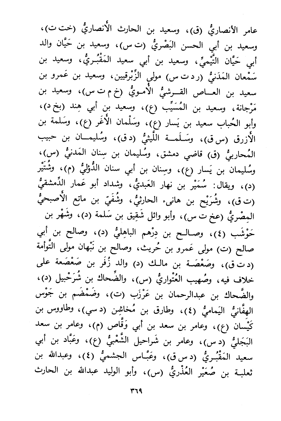عامر الأَنْصارِيّ (ق) ، وسَعِيد بْن الحارث الأَنْصارِيّ (خت ت) ، وسَعِيد بْن أَبي الحسن البَصْرِيّ (ت س) ، وسَعِيد بْن حيان والد أبي حيان التَّيْمِيّ، وسَعِيد بن أَبي سَعِيد المقبري، وسَعِيد بْن سمعان المدني (ر د ت س) مولى الزبرقيين، وسَعِيد بْن عَمْرو بْن سَعِيد بْن العاص القرشي الأُمَوِي (خ م ت س) ، وسَعِيد بْن مرجانة، وسَعِيد بْن المُسَيَّب (ع) ، وسَعِيد بْن أَبي هند (بخ د) ، وأبو الحباب سَعِيد بن يسار (ع) ، وسلمان الأَغَر (ع) ، وسلمة بْن الأزرق (س ق) ، وسلمة الليثي (د ق) ، وسُلَيْمان بن حبيب المحاربي (ق) قاضي دمشق، وسُلَيْمان بْن سنان المدني (س) ، وسُلَيْمان بن يسار (ع) ، وسنان بن أَبي سنان الدؤلي (م) ، وشتير (د) ، ويُقال: سمير بْن نهار العبدي، وشداد أَبُو عمار الدمشقي (ت ق) ، وشريح بْن هانئ الحارثي، وشفي بْن ماتع الأصبحي المِصْرِي (عخ ت س) ، وأبو وائل شقيق بن سلمة (د) ، وشهر بْن حوشب (4) ، وصالح بْن درهم الباهلي (د) ، وصالح بْن أَبي صالح (ت) ، مولى عَمْرو بْن حريث، وصالح بْن نبهان مولى التوأمة (د ت ق) ، وصعصعة بْن مالك (د) والد زفر بْن صعصعة عَلَى خلاف فِيهِ، وصهيب العتواري (س) ، والضحاك بْن شرحبيل (د) ، والضحاك بْن عبد الرحمن بْن عرزب (ت) ، وضمضم بْن جوس الهفاني اليمامي (4) ، وطارق بْن مخاشن (د سي) ، وطاووس بْن كيسان (ع) ، وعامر بْن سعد بْن أَبي وقاص (م) ، وعامر بْن سعد البجلي (د س) ، وعامر بْن شراحيل الشعبي (ع) ، وعباد بْن أَبي سَعِيد المقبري (د س ق) ، وعباس الجشمي (4) ، وعبد اللَّه بْن ثعلبة بْن صعير العذري (س) ، وأبو الوليد عَبد اللَّهِ بْن الحارث