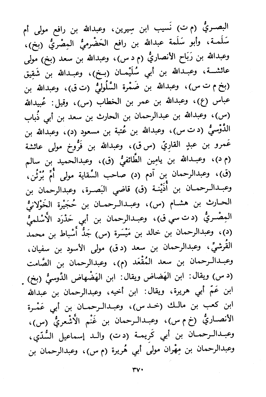 البَصْرِيّ (م ت) نسيب ابْن سيرين، وعبد اللَّه بْن رافع مولى أم سلمة، وأبو سلمة عَبد اللَّهِ بْن رافع الحضرمي المِصْرِي (بخ) ، وعبد الله بن رباح الأَنْصارِيّ (م د س) ، وعَبْد اللَّهِ بْن سعد (بخ) مولى عائشة، وعَبْد اللَّهِ بْن أَبي سُلَيْمان (بخ) ، وعبد اللَّه بْن شقيق (بخ م ت س) ، وعبد الله بن ضمرة السلولي (ت ق) ، وعبد اللَّه بْن عباس (ع) ، وعبد الله بْن عُمَر بْن الخطاب (س) ، وقيل: عُبَيد اللَّه (س) ، وعبد الله بْن عَبْد الرحمن بْن الْحَارِثِ بن سعد بن أَبي ذباب الدوسي (د ت س) ، وعَبْد اللَّهِ بن عتبة بن مسعود (د) ، وعبد اللَّه بْن عَمْرو بْن عبد القاري (س ق) ، وعبد الله بْن فروخ مولى عائشة (م د) ، وعبد الله بْن يامين الطائفي (ق) ، وعبد الحميد بْن سالم (ق) ، وعَبْد الرحمن بْن آدم (د) صاحب السقاية مولى أم برثن، وعبد الرحمن بْن أذينة (ق) قاضي البصرة، وعبد الرحمن بْن الْحَارِث بْن هِشَام (س) ، وعَبْد الرحمن بْن حجيرة الخولاني المِصْرِي (د ت سي ق) ، وعبد الرحمن بن أَبي حدرد الأَسلميّ (د) ، وعبد الرحمن بْن خالد بْن ميسرة (س) جد أسباط بْن مُحَمَّد القرشي، وعبد الرحمن بْن سعد (د ق) مولى الأسود بْن سفيان، وعبد الرحمن بْن سعد المقعد (م) ، وعبد الرحمن بْن الصامت (د س) ويُقال: ابن الهضاض ويُقال: ابن الهضهاض الدوسي (بخ) ابن عم أَبِي هُرَيْرة، ويُقال: ابن أخيه، وعبد الرحمن بْن عَبد اللَّهِ بن كعب بن مالك (خد س) ، وعبد الرحمن بْن أَبي عَمْرة الأَنْصارِيّ (خ م س) ، وعبد الرحمن بْن غنم الأشعري (س) ، وعبد الرحمن بْن أَبي كريمة (د ت) والد إِسْمَاعِيل السدي، وعبد الرحمن بْن مهران مولى أَبِي هُرَيْرة (م س) ، وعبد الرحمن بْن