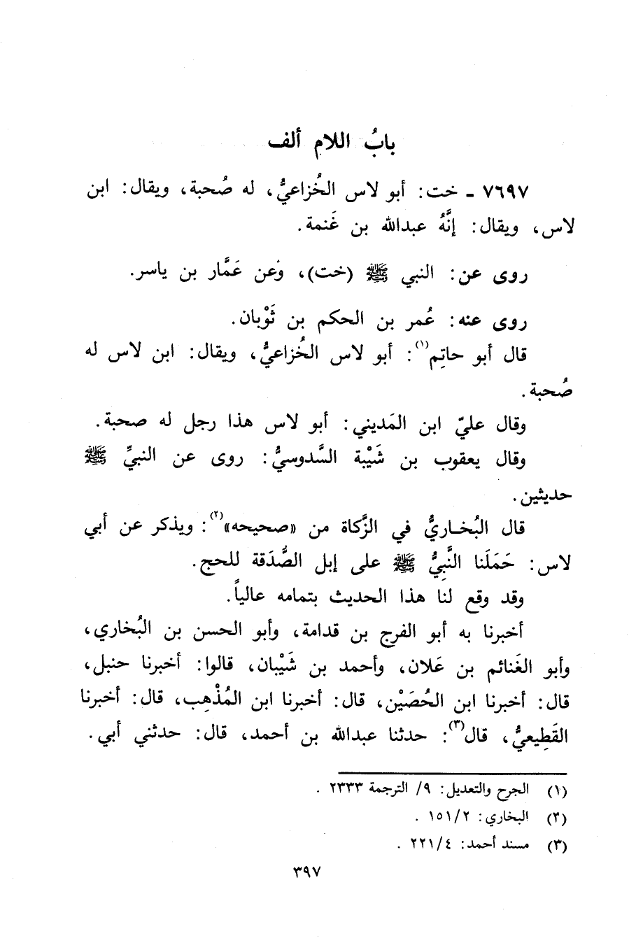 7697 - خت: أبولاس الخزاعي، لهُ صُحبَةٌ، ويُقال: ابن لاس، ويُقال: إنه عَبد اللَّه بْن غنمة.