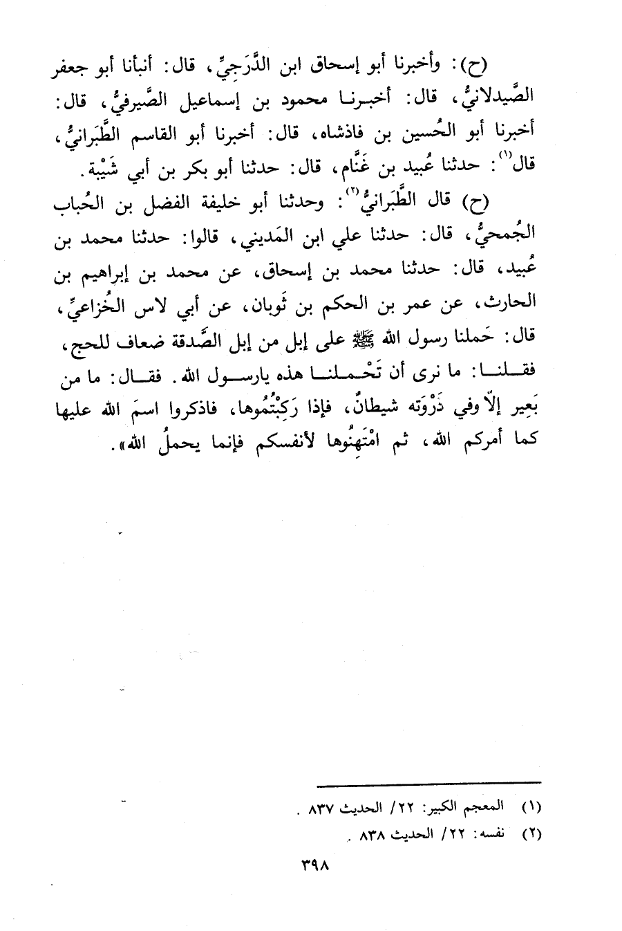 (ح) قال الطَّبَرَانِيُّ (2) : وحَدَّثَنَا أَبُو خَلِيفَةَ الْفَضْلُ بْنُ الْحُبَابِ الْجُمَحِيُّ، قال: حَدَّثَنَا علي ابن الْمَدِينِيِّ، قَالُوا: حَدَّثَنَا مُحَمَّدُ بْنُ عُبَيد، قال: حَدَّثَنَا مُحَمَّدُ بْنُ إِسْحَاقَ، عَنْ مُحَمَّدِ بْنِ إِبْرَاهِيمَ بْنِ الْحَارِثِ، عَنْ عُمَر بْنِ الحكم بْن ثوبان، عَن أَبِي لاسٍ الْخُزَاعِيِّ، قال: حَمَلَنَا رَسُولُ اللَّهِ صلى الله عليه وسلم عَلَى إِبِلٍ مِنْ إِبِلِ الصَّدَقَةِ ضِعَافٍ لِلْحَجِّ، فَقُلْنَا: مَا نَرَى أَنْ تَحْمِلْنَا هَذِهِ يَا رَسُولَ اللَّهِ. فَقَالَ: مَا مِنْ بَعِيرٍ إِلا وفِي ذُرْوَتِهِ شَيْطَانٌ، فَإِذَا رَكَبْتُمُوهَا، فَاذْكُرُوا اسْمَ اللَّهِ عَلَيْهَا كَمَا أَمَرَكُمُ اللَّهُ، ثُمَّ امْتَهِنُوهَا لأنفسكم فإنما يحمل الله.