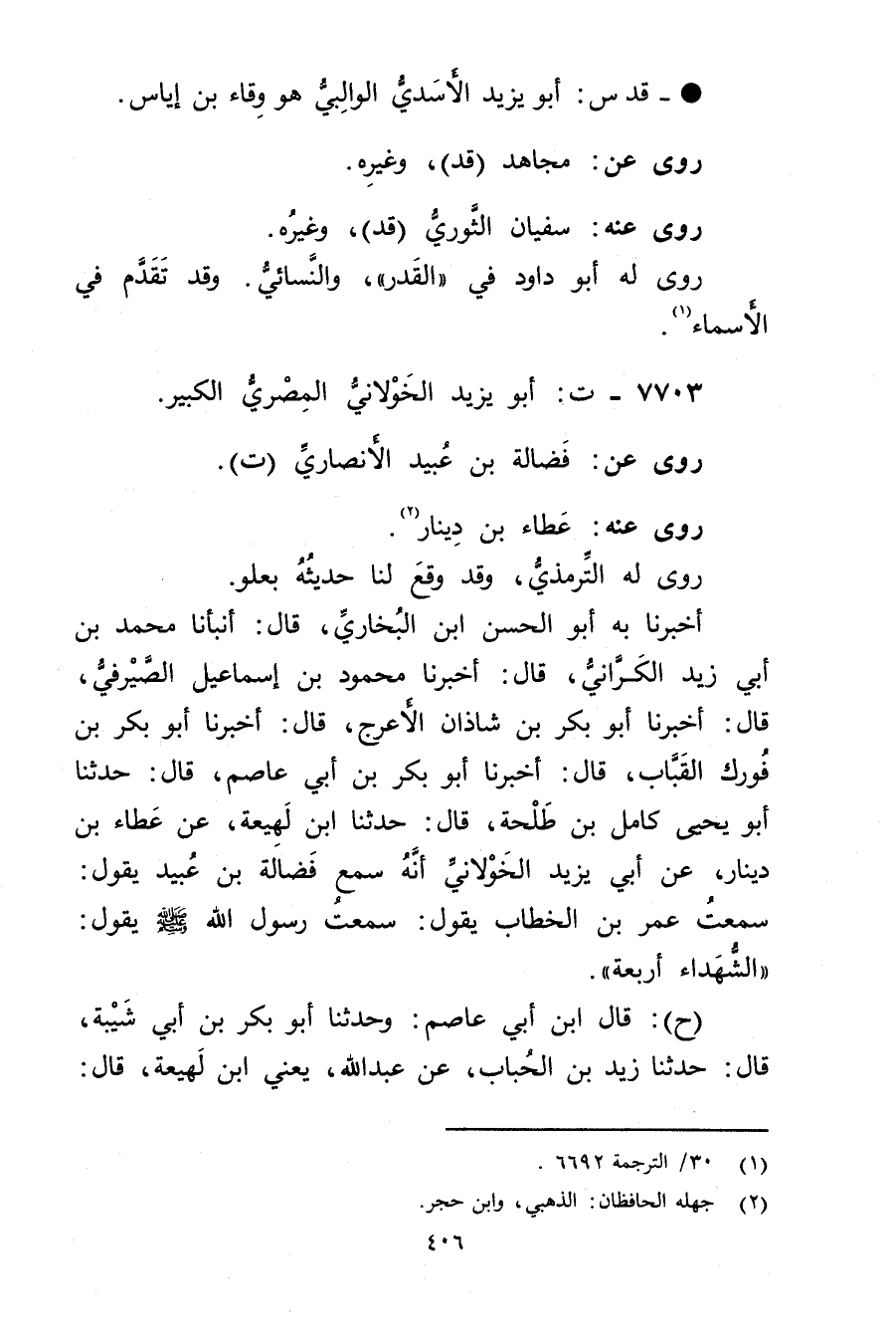 أخبرنا به أبو الحسن بْن البخاري، قال: أَنْبَأَنَا مُحَمَّدُ بْنُ أَبي زَيْدٍ الْكَرَّانِيُّ، قال: أَخْبَرَنَا مَحْمُودُ بْنُ إِسْمَاعِيلَ الصَّيْرَفِيُّ، قال: أخبرنا أَبُو بَكْرِ بْنُ شَاذَانَ الأَعْرَجُ، قال: أَخْبَرَنَا أَبُو بَكْرِ بْنُ فُورَكٍ الْقَبَّابُ، قال: أَخْبَرَنَا أَبُو بَكْرِ بْنُ أَبي عَاصِمٍ، قال: حَدَّثَنَا أبويحيى كَامِلُ بْنُ طَلْحَةَ، قال: حَدَّثَنَا ابْن لَهِيعَة، عَنْ عَطَاء بْن دِينَارٍ، عَن أَبِي يَزِيدَ الْخَوْلانِيِّ أَنَّهُ سَمِعَ فَضَالَةَ بْنَ عُبَيد يَقُولُ: سَمِعْتُ عُمَر بْنَ الْخَطَّابِ يقول: سمعت رَسُول اللَّهِ صَلَّى اللَّهُ عَلَيْهِ وسَلَّمَ يَقُولُ: الشُّهَدَاءُ أَرْبَعَةٌ.
