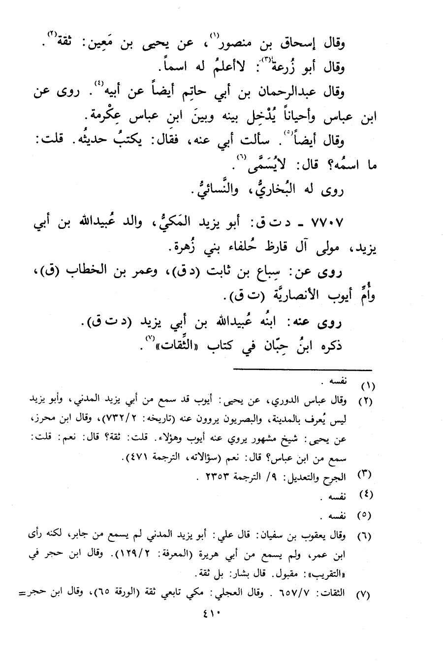 (6) وَقَال يعقوب بْن سفيان: قال علي: أبو يزيد المدني لم يسمع من جابر، لكنه رأى ابن عُمَر، ولم يسمع من أَبِي هُرَيْرة (المعرفة: 2 / 129) . وَقَال ابن حجر في "التقريب": مقبول. قال بشار: بل ثقة.