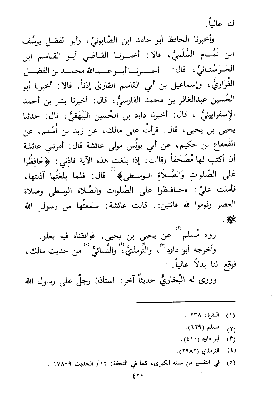 يَحْيَى بْنُ يَحْيَى، قال: قَرَأْتُ عَلَى مَالِكٍ، عَنْ زَيْدِ بْنِ أَسْلَمَ، عَنِ الْقَعْقَاعِ بْنِ حَكِيمٍ، عَن أَبِي يُونُسَ مَوْلَى عَائِشَةَ قال: أَمَرَتْنِي عَائِشَةُ أَنْ أَكْتُبَ لَهَا مُصْحَفًا وَقَالت: إِذَا بَلَغْتَ هَذِهِ الآيَةَ فَآذِنِّي: (حَافِظُوا عَلَى الصَّلَوَاتِ والصَّلاةِ الْوُسْطَى) (1) قال: فَلَمَّا بَلَغْتُهَا آذَنْتُهَا، فَأَمْلَتْ عَلَيَّ: حَافِظُوا عَلَى الصَّلَوَاتِ والصَّلاةِ الْوُسْطَى وصَلاةِ الْعَصْرِ وقُومُوا لِلَّهِ قَانِتِينَ". قَالَتْ عَائِشَةُ: سَمِعْتُهَا مِنْ رَسُول اللَّهِ صلى الله عليه وسلم.