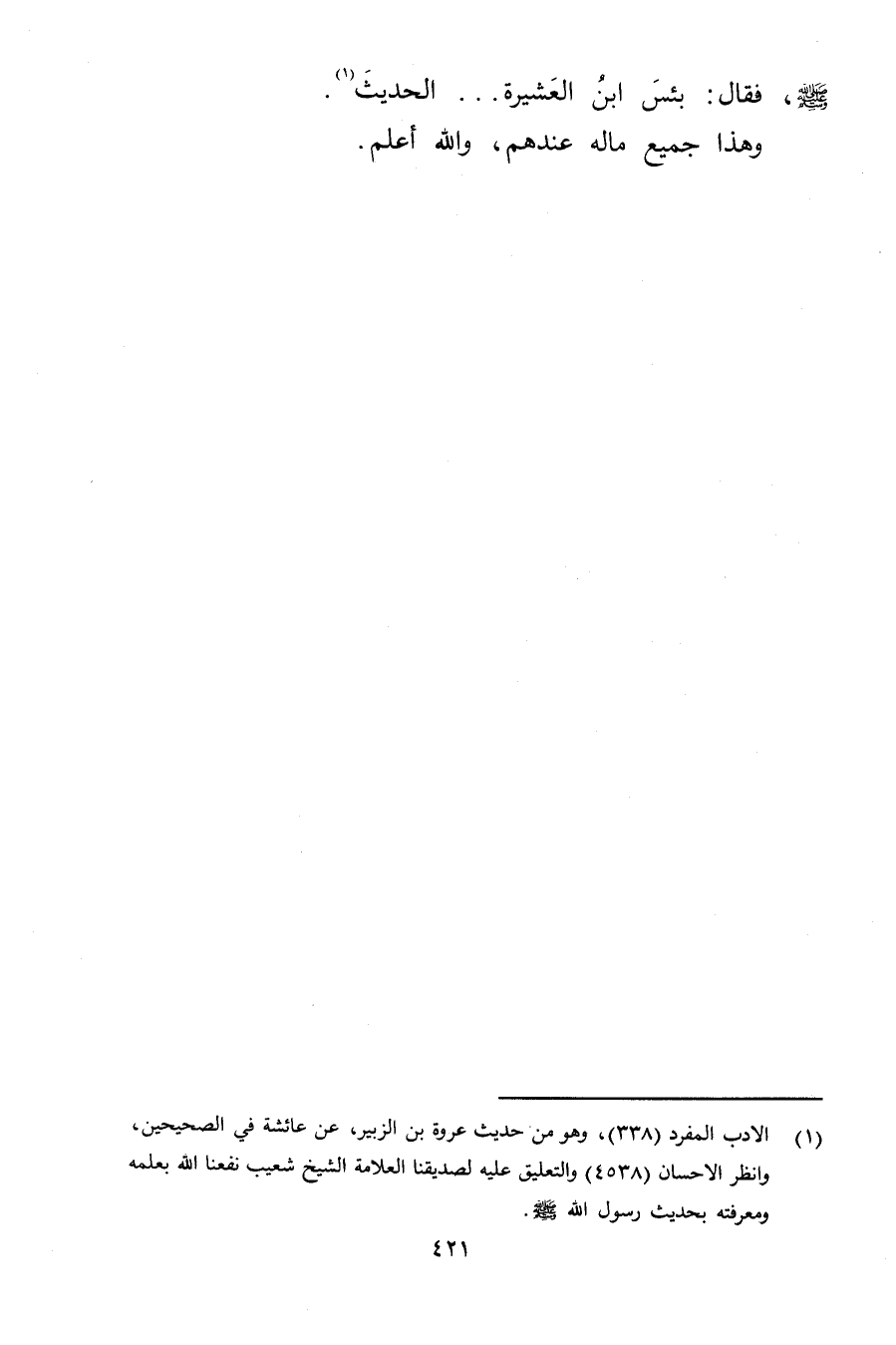 (1) الادب المفرد (338) ، وهو من حديث عُرْوَةَ بْنِ الزُّبَيْرِ، عَنْ عَائِشَةَ في الصحيحين، وانظر الاحسان (4538) والتعليق عليه لصديقنا العلامة الشيخ شعيب نفعنا الله بعلمه ومعرفته بحديث رسول الله صلى الله عليه وسلم.
