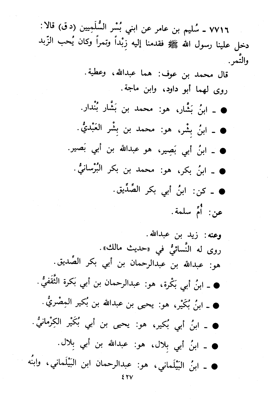7716 - سُلَيْمِ بْنِ عَامِرٍ عَنِ ابْنَيْ بسر السلميين (د ق) قَالا: دَخَلَ عَلَيْنَا رَسُولُ اللَّهِ صلى الله عليه وسلم فَقَدَّمْنَا إِلَيْهِ زبدا وتمرا وكان يحب الزبد والتمر.