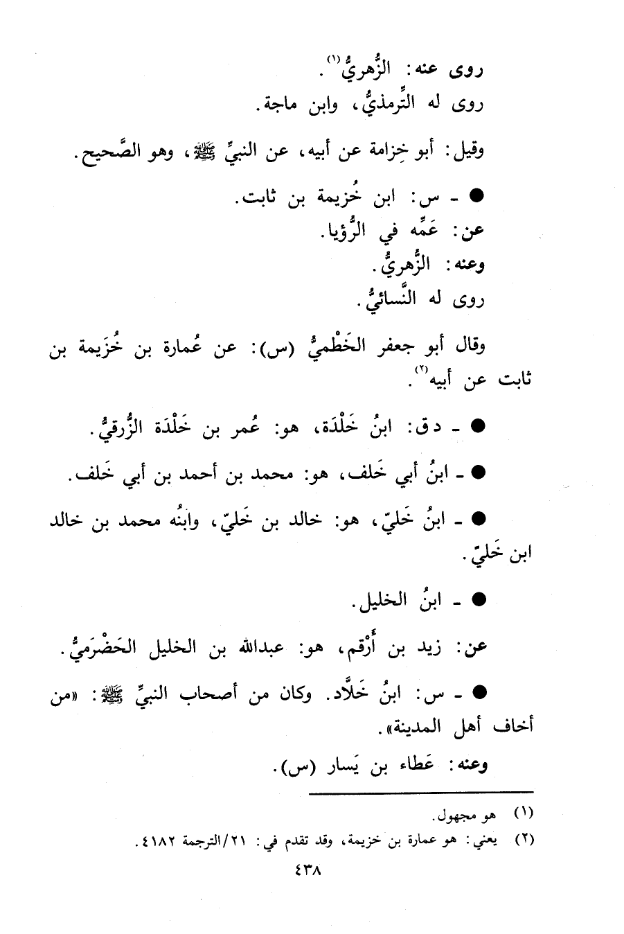 وَقَال أَبُو جَعْفَر الخطمي (س) : عن عُمَارَةَ بْنِ خُزَيْمَةَ بْنِ ثابت عَن أبيه (2) .