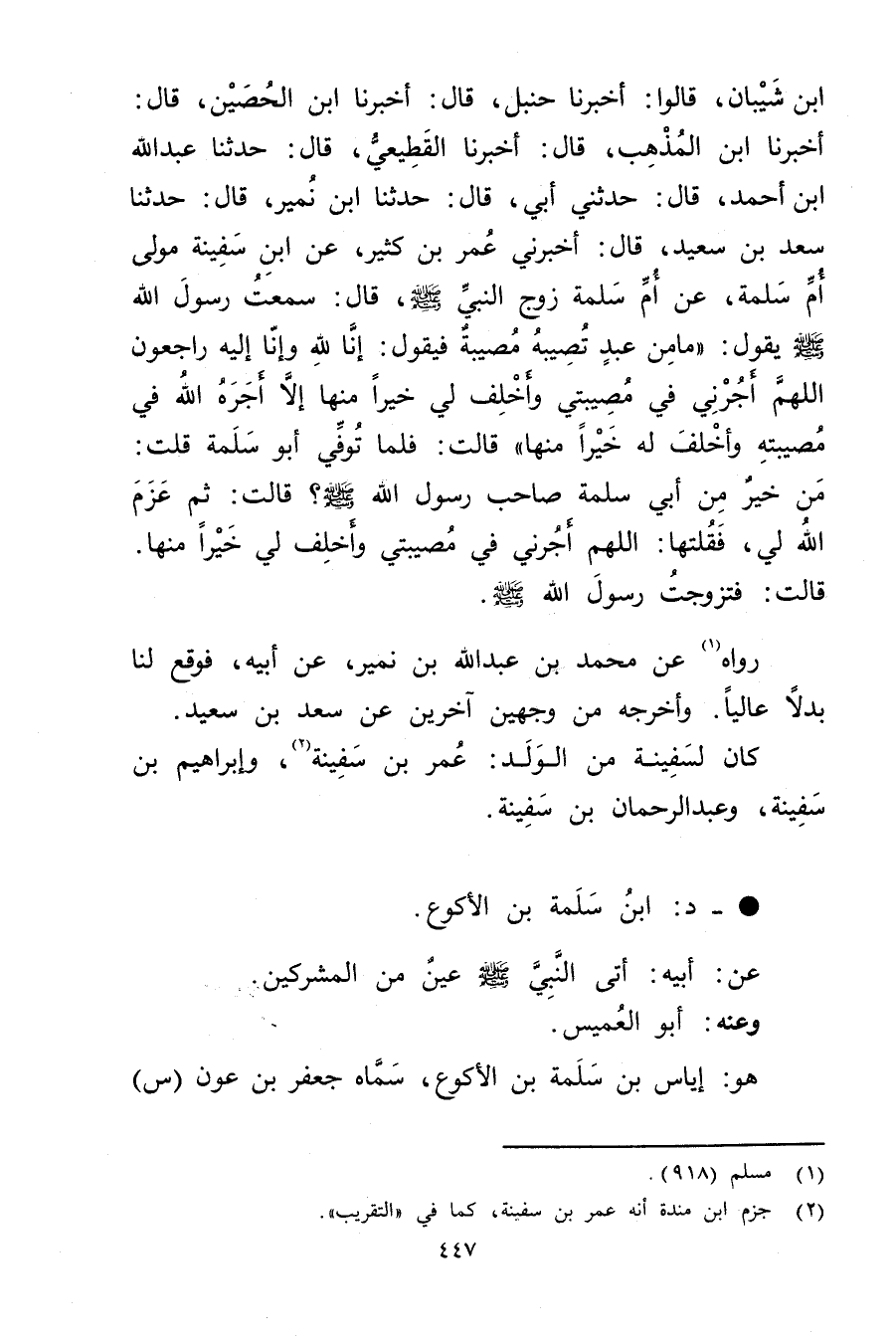 ابْنُ شَيْبَانَ، قَالُوا: أَخْبَرَنَا حَنْبَلٌ، قال: أخبرنا ابن الحصين، قال: أخبرنا ابْنُ الْمُذْهِب، قال: أخبرنا القَطِيعِيّ، قال: حَدَّثَنَا عَبد الله بْن أَحْمَدَ، قال: حَدَّثني أبي، قال: حَدَّثَنَا ابْنُ نُمَيْرٍ، قال: حَدَّثَنَا سَعْدُ بْنُ سَعِيد، قال: أَخْبَرَنِي عُمَر بْنُ كَثِيرٍ، عَنِ ابن سفينة مولى أم سلمة، عن أم سَلَمَة زوج النَّبِيّ صلى الله عليه وسلم، قال: سمعت رَسُول اللَّهِ صَلَّى اللَّهُ عَلَيْهِ وَسَلَّمَ يقول: ما من عَبْدٍ تُصِيبُهُ مُصِيبَةٌ فَيَقُولُ: إِنَّا لِلَّهِ وإِنَّا إِلَيْهِ رَاجِعُونَ اللَّهُمَّ أَجُرْنِي فِي مُصِيبَتِي وأَخْلِفْ لِي خَيْرًا مِنْهَا إِلا أَجَرَهُ اللَّهُ فِي مُصِيبَتِهِ وأَخْلَفَ لَهُ خَيْرًا مِنْهَا" قَالَتْ: فَلَمَّا تُوُفِّيَ أَبُو سَلَمَةَ قُلْتُ: مَنْ خَيْرٌ مِنْ أَبِي سَلَمَةَ صَاحِبِ رَسُولِ اللَّهِ صَلَّى اللَّهُ عَلَيْهِ وسَلَّمَ؟ قَالَتْ: ثُمَّ عَزَمَ اللَّهُ لِي، فَقُلْتُهَا: اللَّهُمَّ أَجُرْنِي فِي مُصِيبَتِي وأَخْلِفْ لِي خَيْرًا مِنْهَا. قَالَتْ: فَتَزَوَّجْتُ رَسُول اللَّهِ صلى الله عليه وسَلَّمَ.