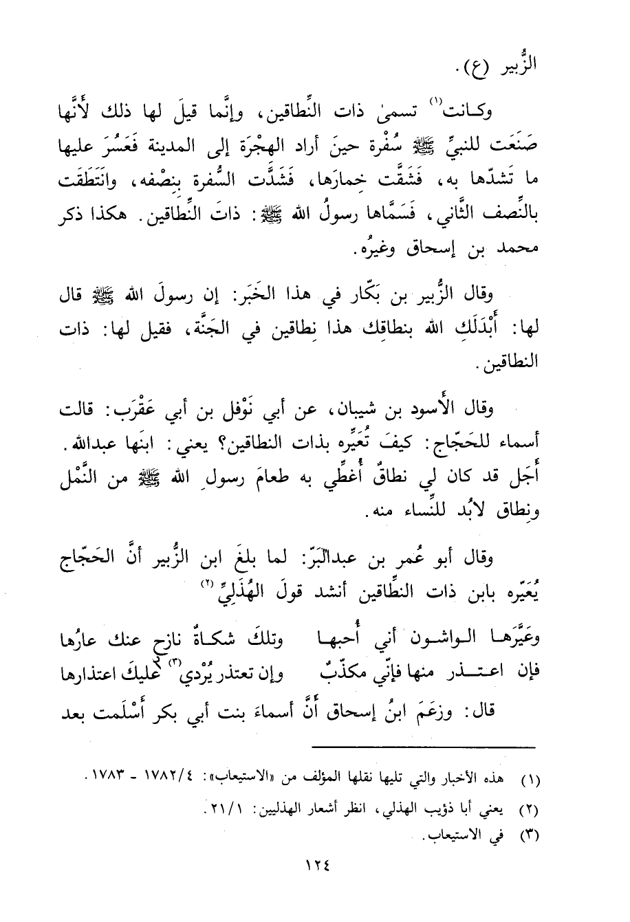 وَقَال أبو عُمَر بن عَبد الْبَرِّ: لما بلغ ابن الزبير أن الحجاج يعيره بابن ذات النطاقين أنشد قول الهذلي (2)