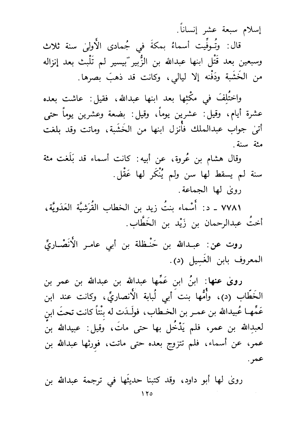 7781 - د: أسماء بنت زيد بن الخطاب القرشية العدوية، أخت عبد الرحمن بن زيد بن الخطاب.