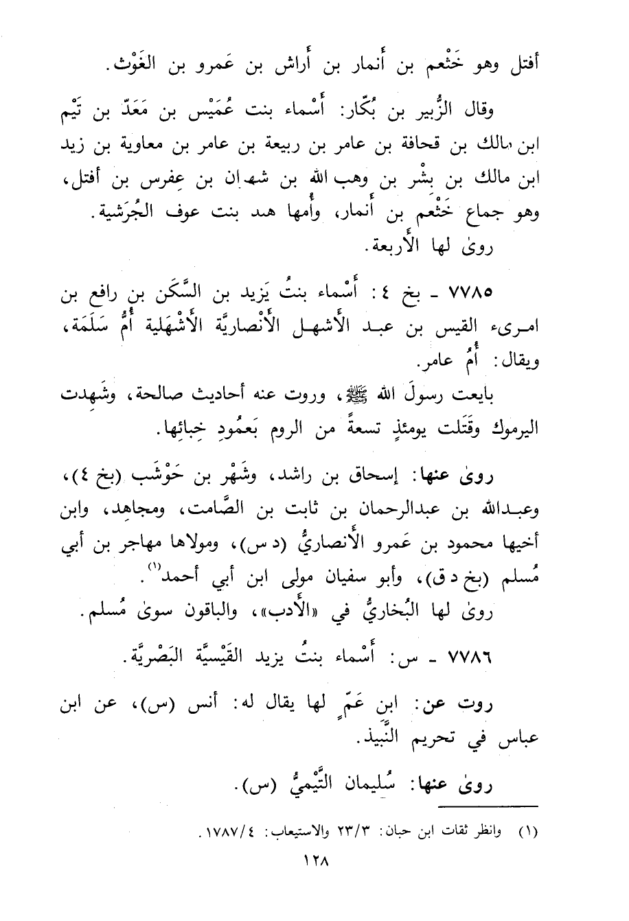 7785 - بخ 4: أسماء بنت يزيد بن السكن بن رافع بن امرئ القيس بن عبد الأشهل الأَنْصارِيّة الأشهلية أم سلمة، ويُقال: أم عامر.